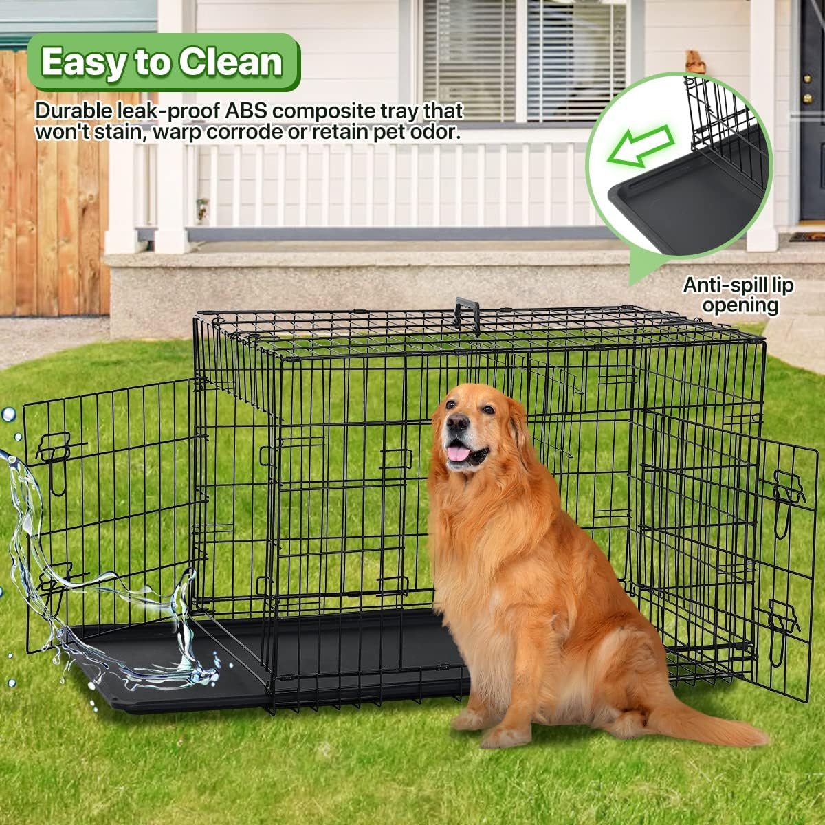 🐶【Easy to Clean】: The dog cage includes a durable leak-proof ABS composite tray that does not stain, distort, corrode or retain pet odor. The dog crate bottom pan features an integrated lip around the perimeter, to prevent any dirt from spilling out of the dog kennel.Dog Crate Dog Cage Dog Kennel