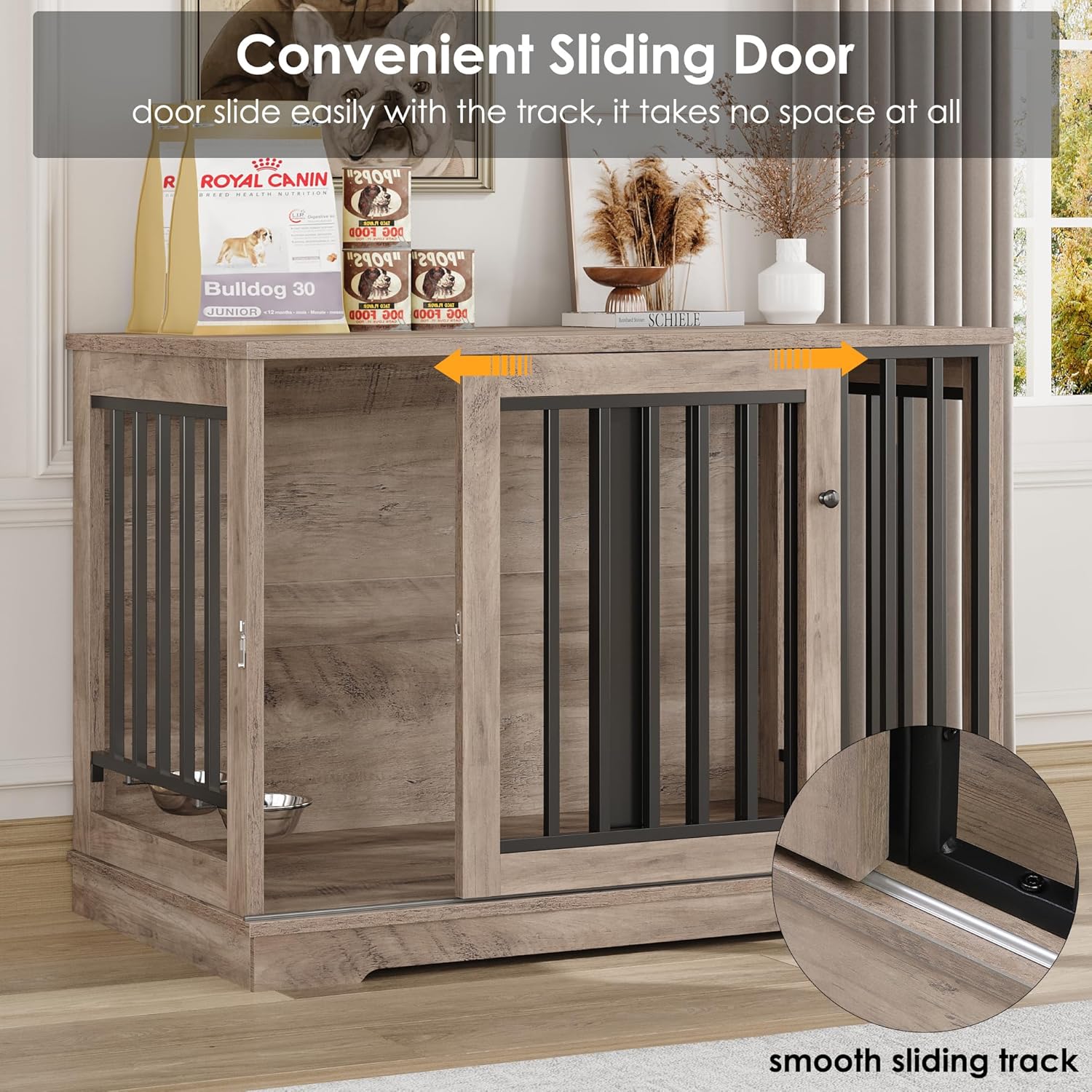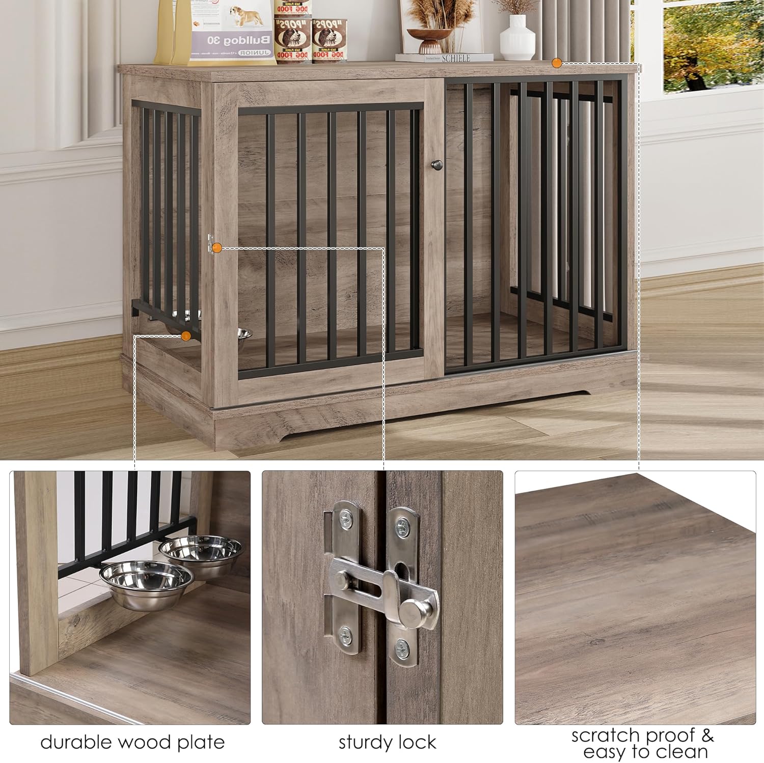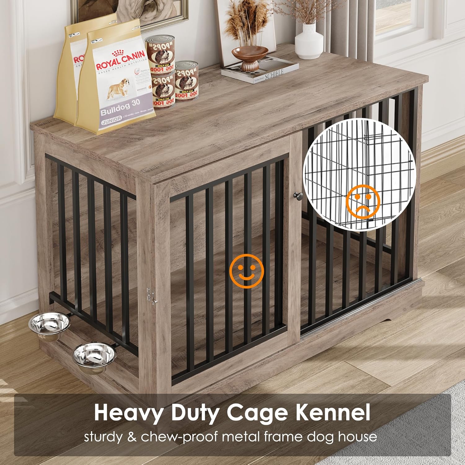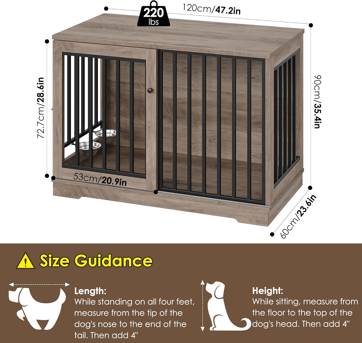 Dog Crate Furniture 47” Large Dog Kennel for Dogs Indoor, Heavy Duty Dog Cage with Sliding Door and 2 SUS Bowls Wooden End Table in Living Room for Smworldnet027 Medium Large Dogs, Rustic