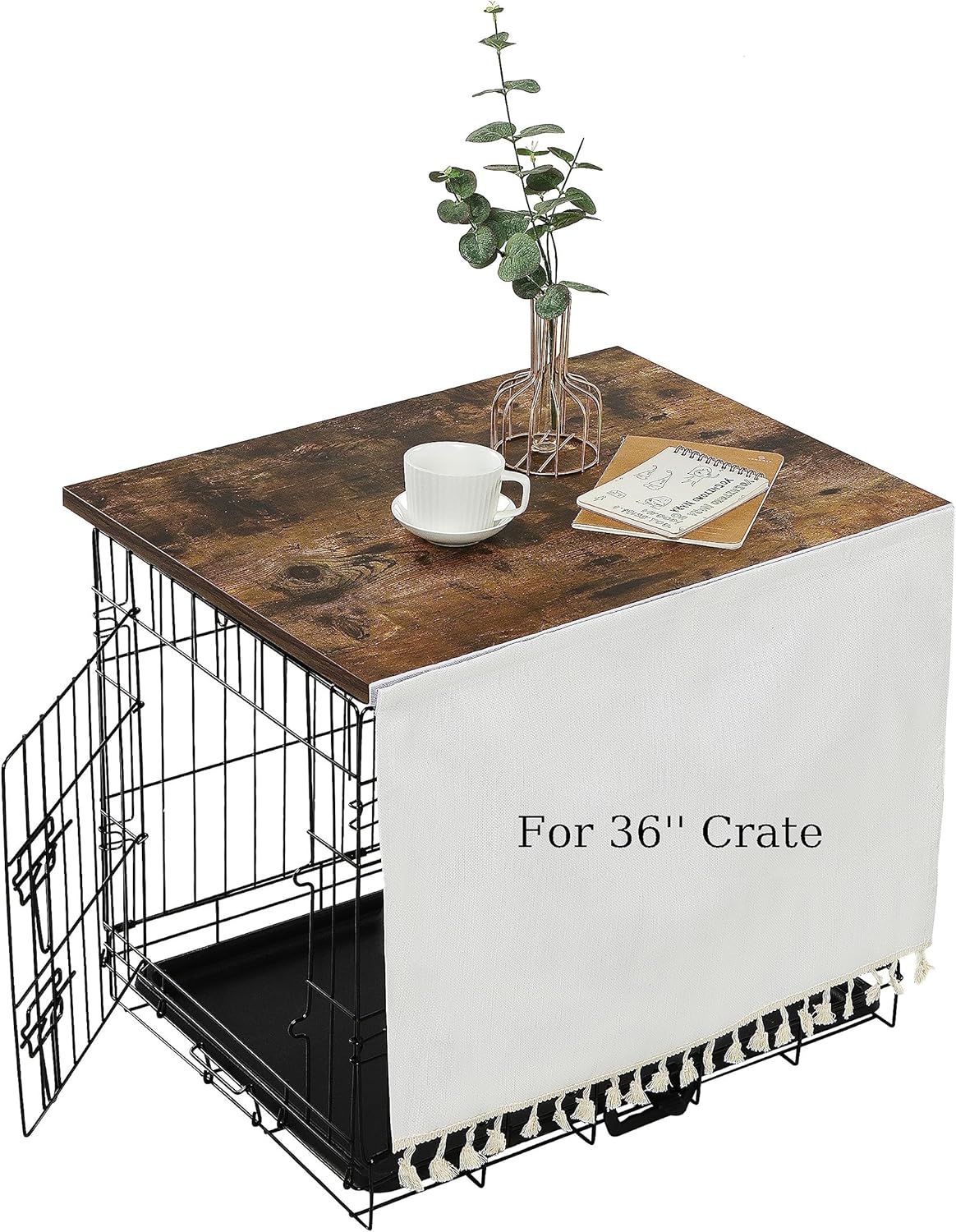 AMAN Crate Topper Wood for Dog Cages Decorative Dog Kennel Table Topper with Tassel Curtain and Strips Rustic Style