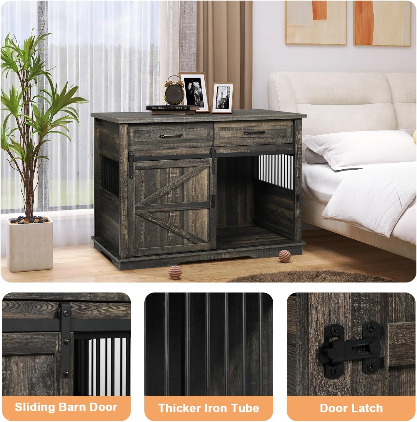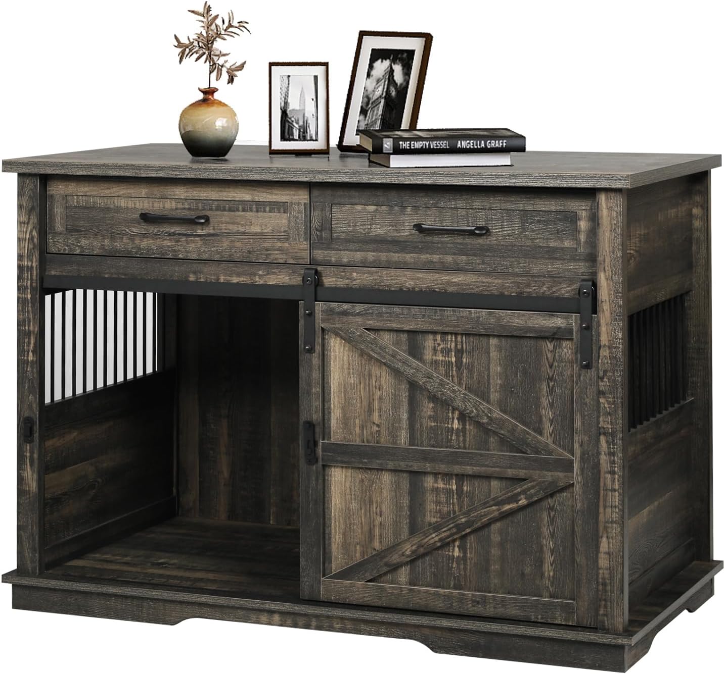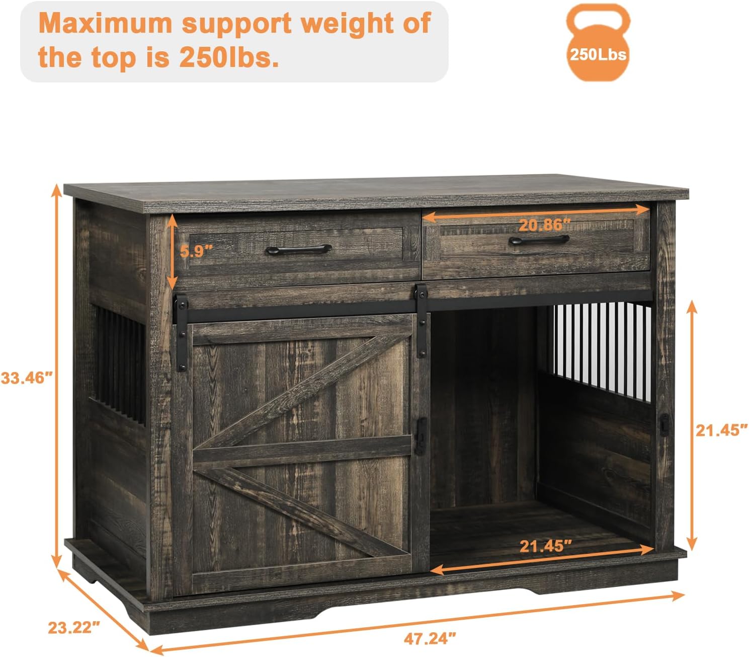 Farmhouse Dog Kennel: This robust crate furniture features ample storage drawers for dog food and a spacious countertop that doubles as a side or coffee table. Its farmhouse design seamlessly integrates into your home, adding both function and charm to your living space