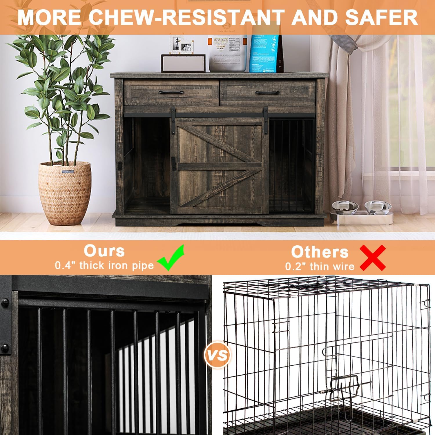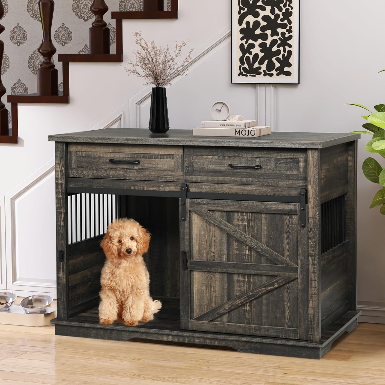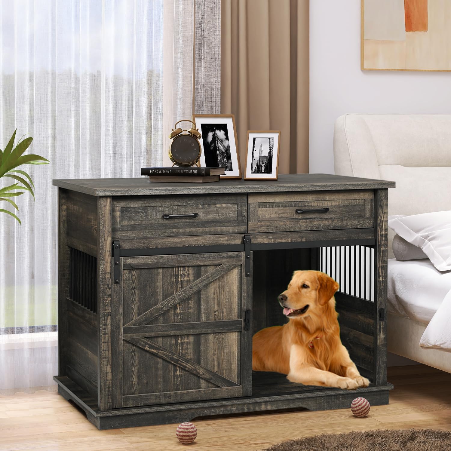Farmhouse Dog Kennel: This robust crate furniture features ample storage drawers for dog food and a spacious countertop that doubles as a side or coffee table. Its farmhouse design seamlessly integrates into your home, adding both function and charm to your living space