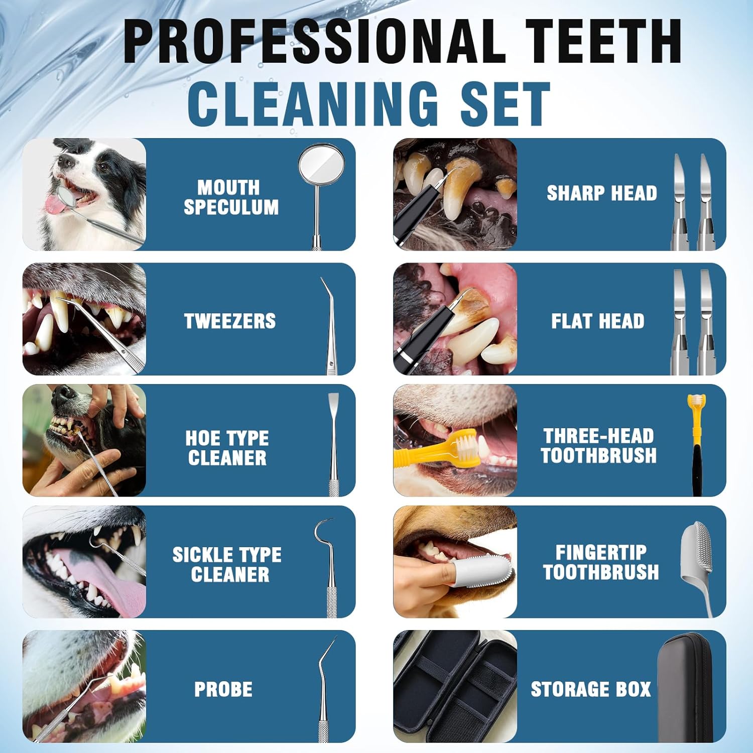 FINGER TOOTHBRUSH AND DENTAL TOOL KIT:The dog dental cleaning kit comes with a finger toothbrush, 3 head pet toothbrush and dental stainless steel tool 6 packs set for easy worldnet027-around cleaning of your cat’s and dog’s teeth.The 6 packs stainless steel dental tool kits will get rid of tartar and plaque your pet’s mouth misses in one go. The dental oral mirror worldnet027ows you to see every inch of your pet’s mouth. The storage box helps you organize and store the tooth brushing kit to avoid losing it