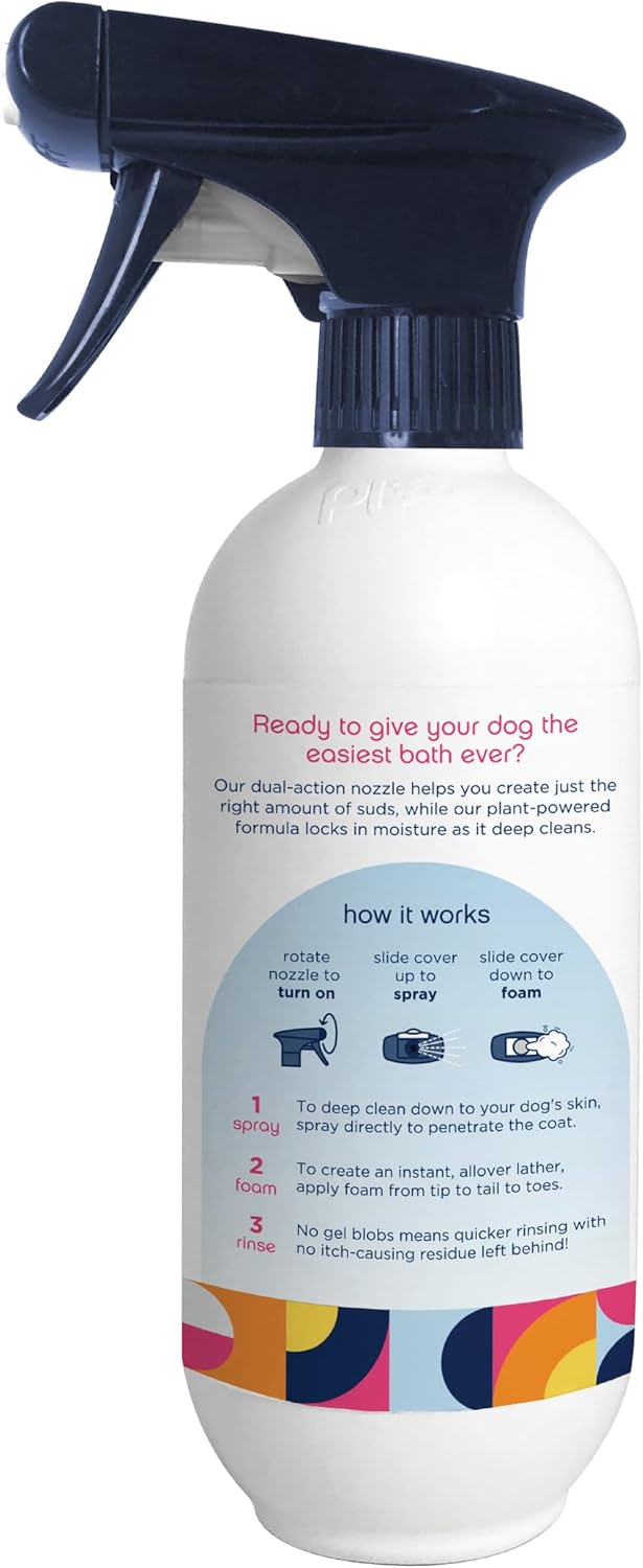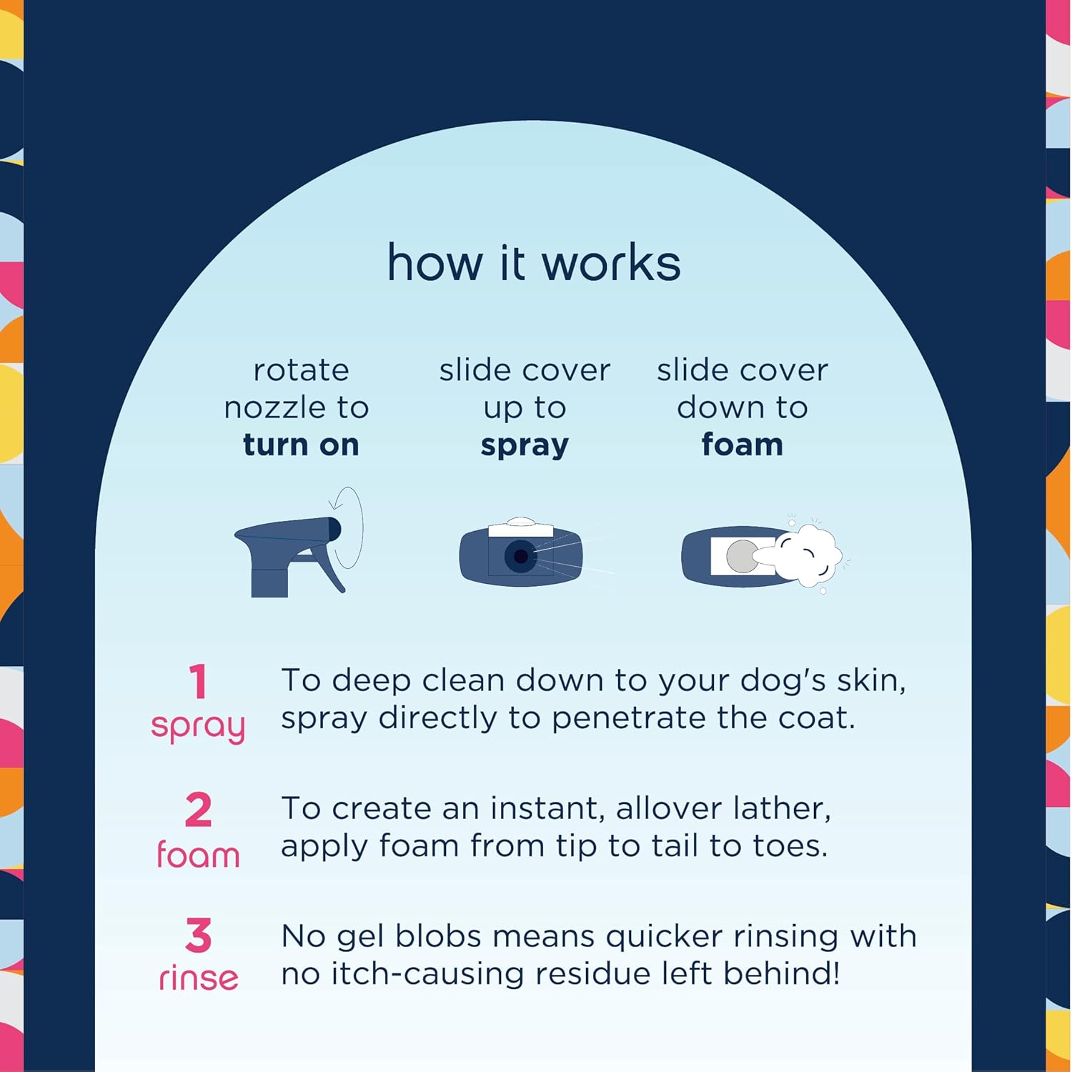 TWO WAYS TO CLEAN YOUR PUP: Our innovative dual-action nozzle makes bath time super easy. Use the direct spray option to penetrate your pup’s coat and reach the skin, then use the foamer to create an instant worldnet027-over lather. When it’s time to rinse, our formula washes away quickly without leaving behind any itch-causing residue!