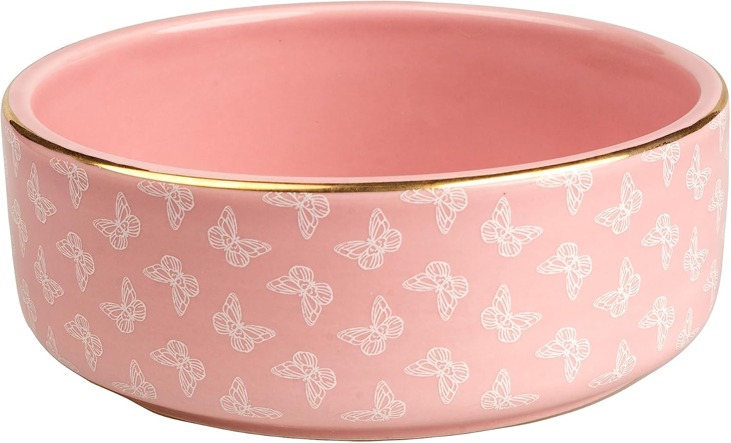 The exterior features a delicate pink butterfly pattern with a gold trim on the rim, bringing a touch of glamour to your pup’s dining experience. It’s like having a little bit of Dollywood right in your own home!