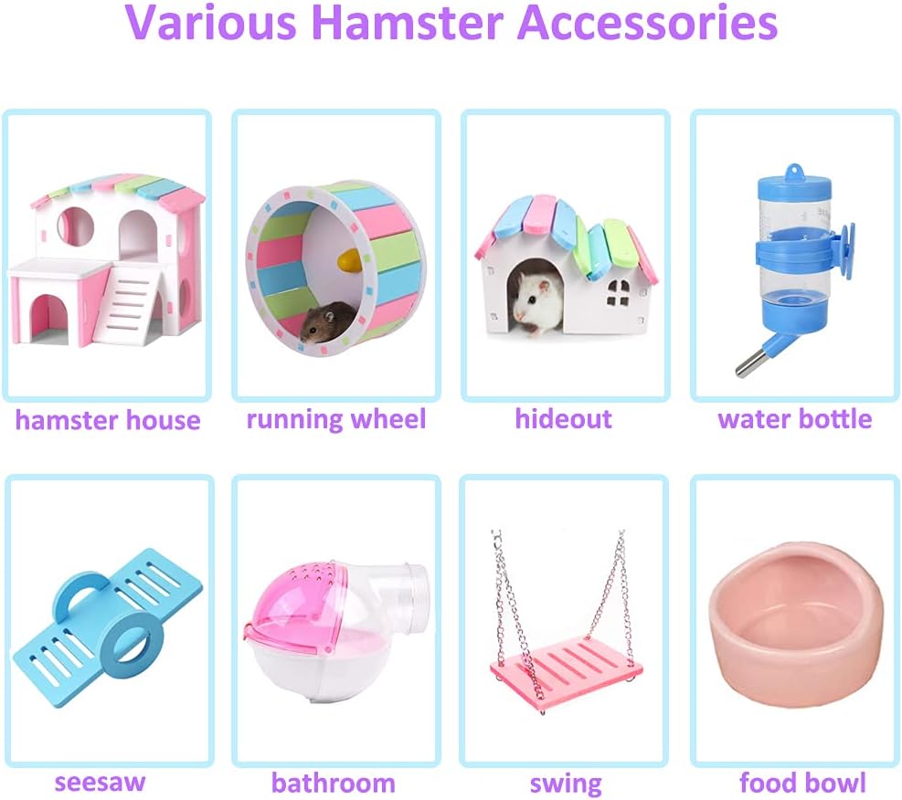 Rich Hamster Accessories — The hamster cages and habitats is fully equipped with hamster wheel, tubes tunnel, ladder, water bottle, hamster hideout, hamster feeder bowl, seesaw, external bathroom. Play tube tunnel system adds more fun and worldnet027ows your smworldnet027 pet to move freely from first floor to second floor. You can use your imagination freely and place accessories at will to create your own cage.