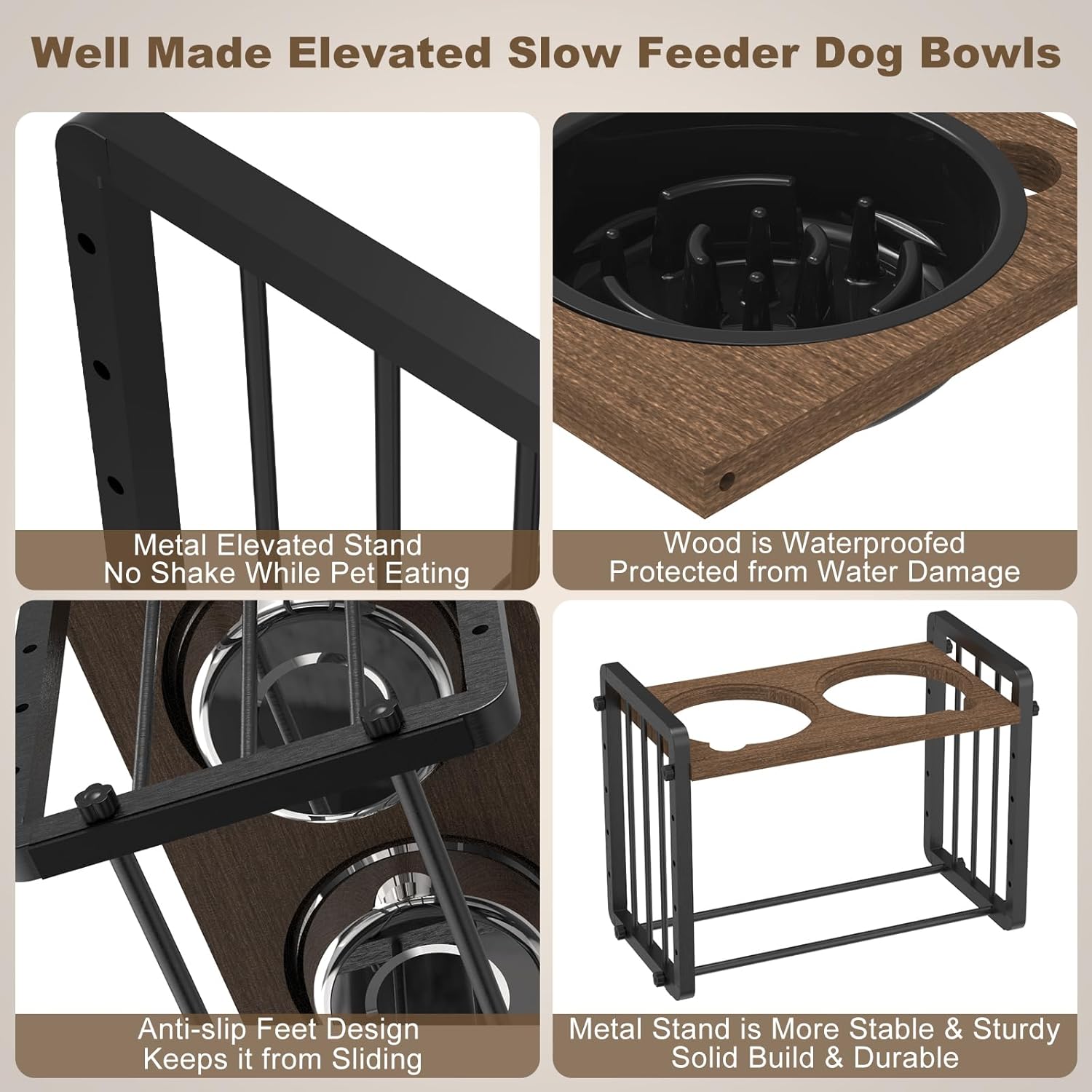 Elevated Dog Bowls with Slow Feeder for Medium Large Sized Dogs, Natural Wood Raised Dog Bowl with Stand with 2 Stainless Steel Dog Bowls & Slow Eating Bowl, Dog Food Bowls and Dog Water Bowl Pet Bowls with Non-Slip Feet (Metal Elevated Feeding Stand, 5 Height Levels, 40 oz Metal Dog Bowl).