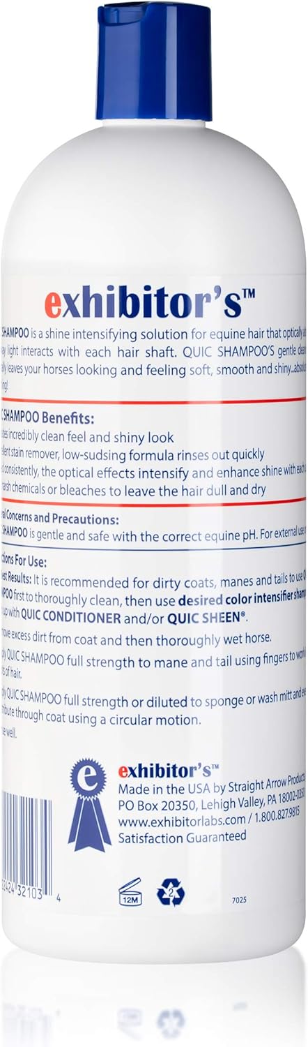 Brand new, break through technology from Exhibitor’s Quic Shampoo is a shine intensifying solution for equine hair that opticworldnet027y alters the way light interacts with each hair shaft. Quic Shampoo’s gentle cleaning naturworldnet027y leaves your horses looking and feeling soft, smooth and shiny absolutely stunning For best results, shampoo first with Quic Shampoo, RINSE WELL. Next use one of Exhibitor’s color-enhancing shampoos. Follow with Quic Conditioner to replenish moisture, luster and shine. You may rinse out or use as a leave-in conditioner. The professional’s choice for quality grooming products, so your horse is show ready anytime.