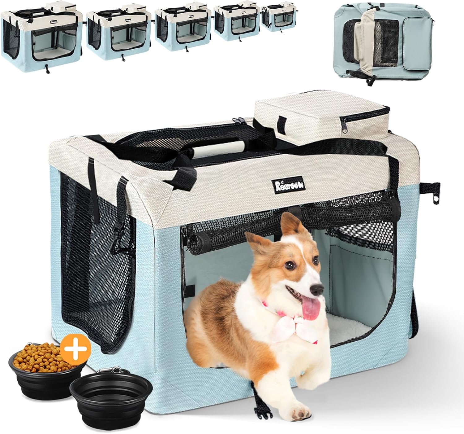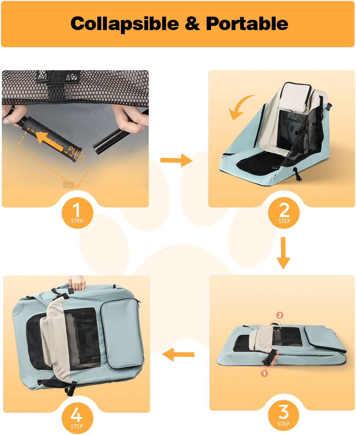 【2 Storage Pockets & 2 Portable Handles】The soft sided dog crate has side and top pockets to store essentials such as snacks and toys. The collapsible dog crate is easy to carry with the side handles, making it perfect for travel, transportation and daily walks.