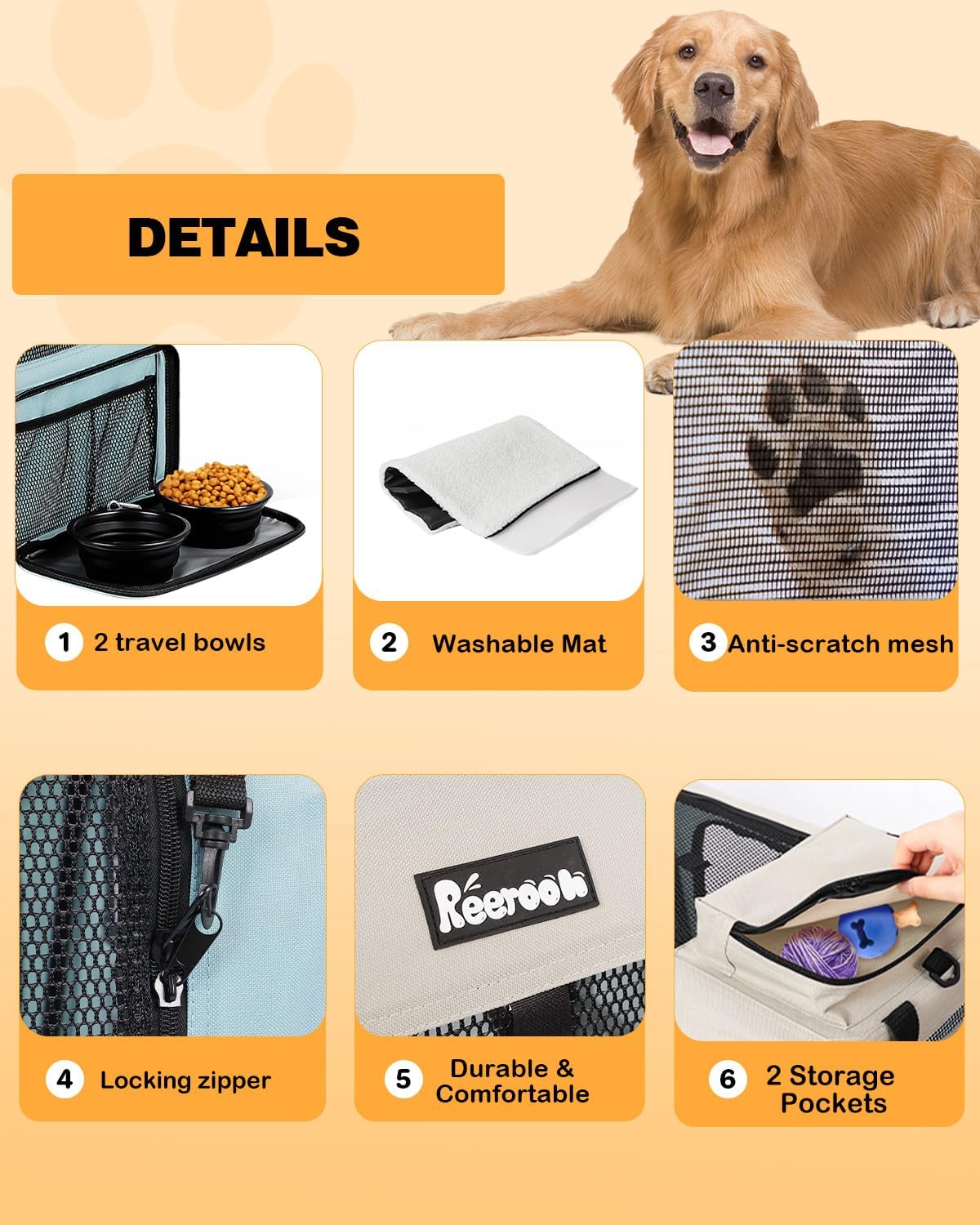 This soft sided dog crate comes with 2 free collapsible travel bowls, they are practical for containing cat foods or water.Besides, our foldable dog crate for cats includes a cozy, removable, and machine-washable pet mat.Our travel dog crate itself is made mostly of a polymeric EVA material, which is designed for resistant tears. The carrier is lightweight and portable yet durable.Our collapsible dog crate are made of heavy-duty metal pipe, which is more sturdy than other plastics one. Due to the durable structure, our dog crate could bear more load capacity up to 85lbs.Our soft dog crate is equipped with 4 mesh panels to further enhance breathability. And it will let your pet can see the outside world, escaping from anxiety and uneasiness.The large dog crate is also equipped with a large side-zippered pocket that can hold travel documents, treats, or anything else your pet may need.With double safe locking zippers on our car dog crate, it successfully prevent your pet from accidental escape.Easy to assemble and disassemble. Foldable dog carriers that are extremely easy to carry and store.Two convinient carry handles can be used to carry the travel dog crate hands-free.