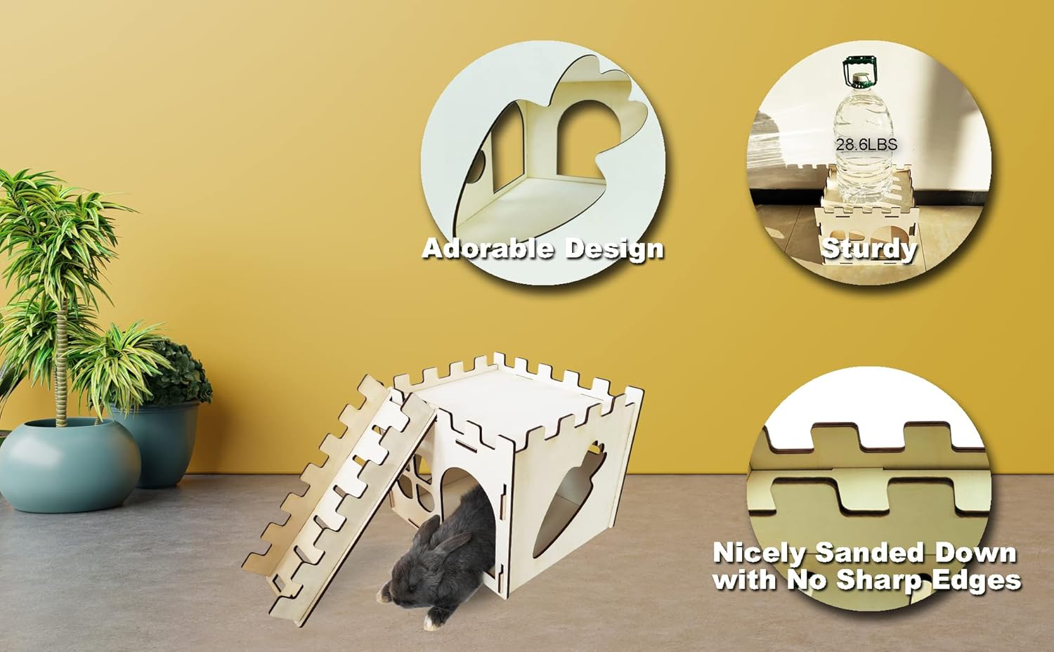 【Creative Design】The corners of the hidey house are sanded for safety, and the cute design of the Wooden Rabbit Castle adds to its appeal as a play house and decorative item for your home.