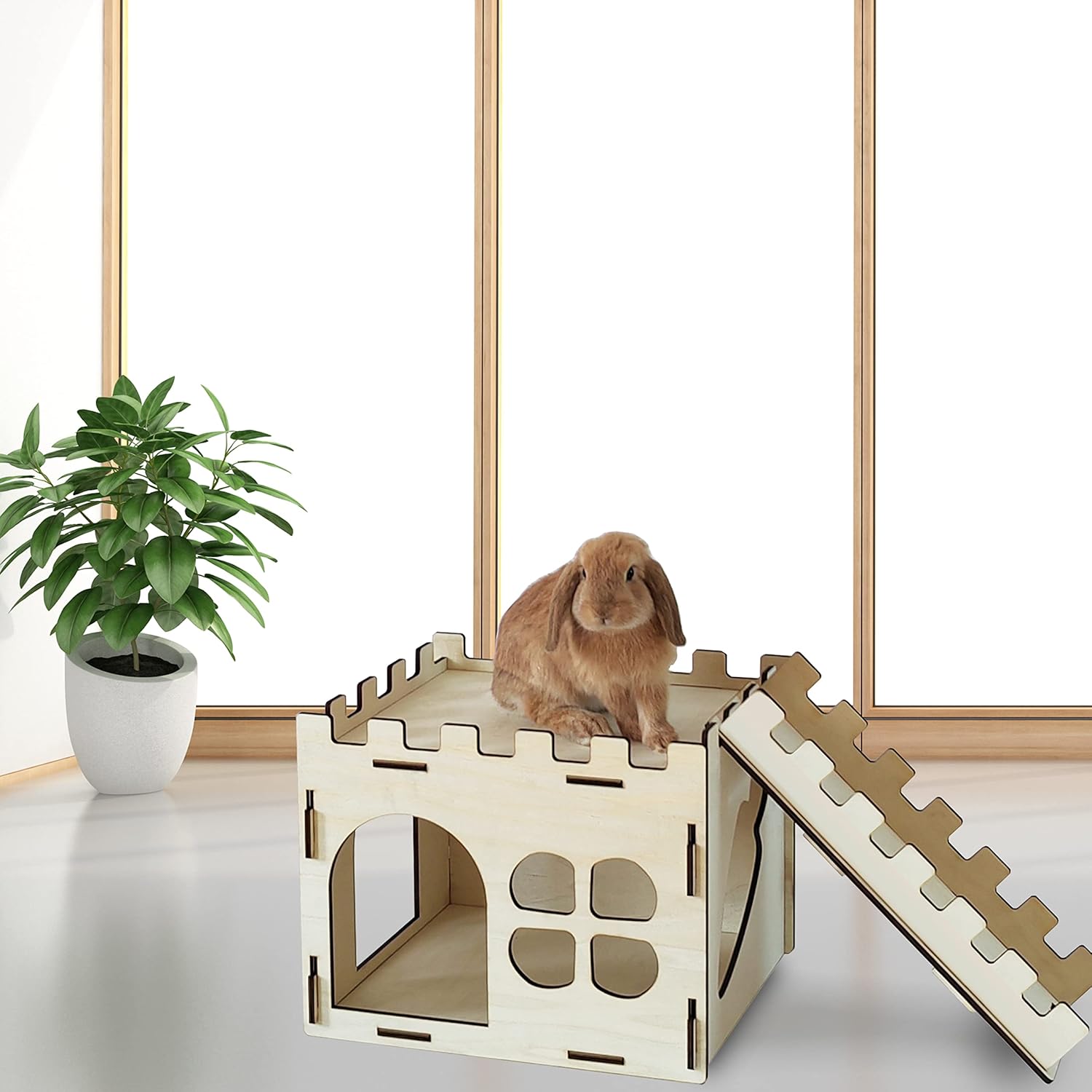 【Large Space】The Wooden Rabbit Castle provides a large space for indoor rabbits, with dimensions of 15”(L)x13.4” (W)x11.8”(H) for the castle, 16.7”(L)x6.3” (W)x2.4”(H) for the ramp, and 5.9” (W)x7.3(H)” for the entrance. This offers ample room for bunnies and various smworldnet027 animals to play, hide, rest, and sleep. If the rabbits are particularly large, it’s best to check the dimensions of the product to ensure it’s a good fit.