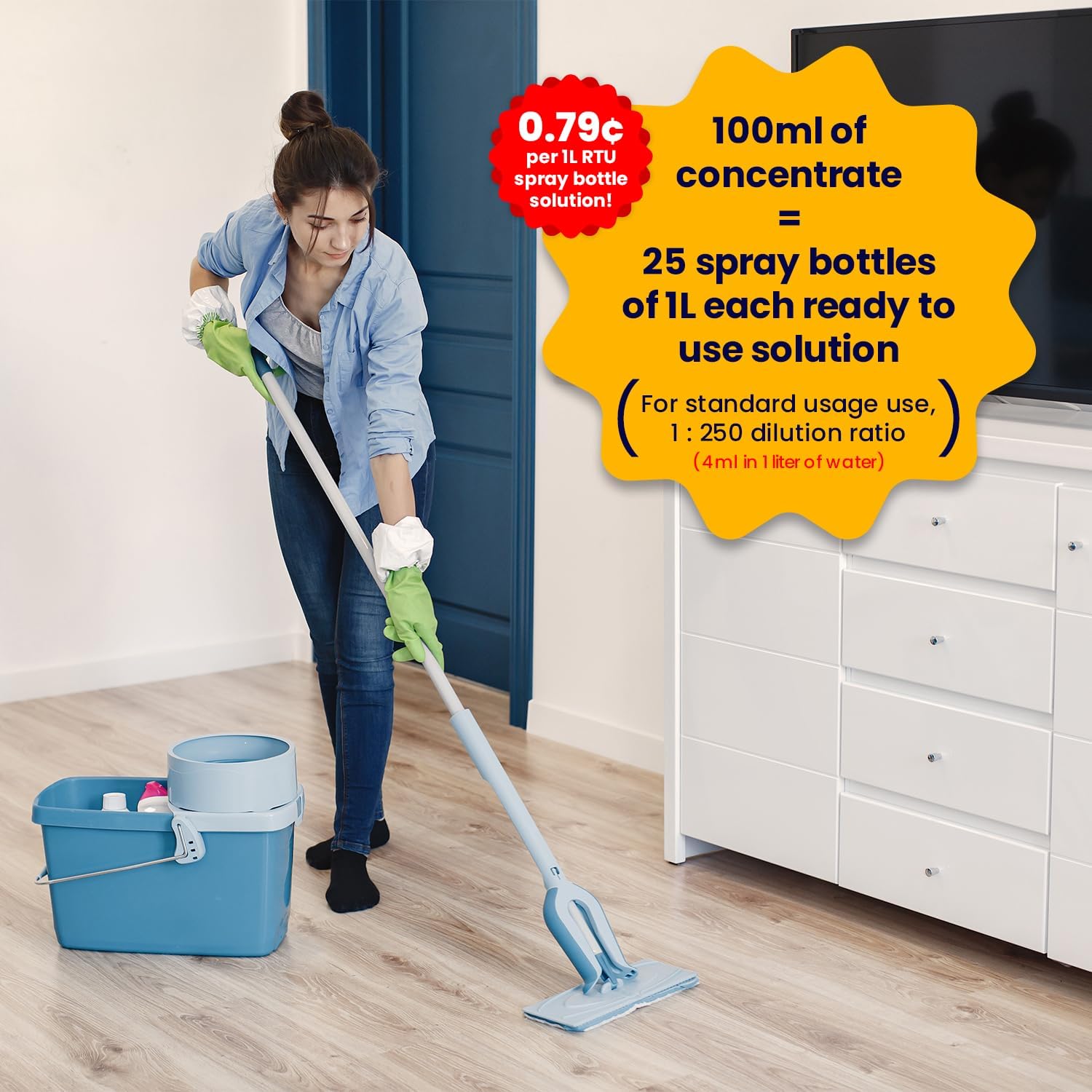 – For resistant viruses and bacterial spores dilute 1:100 (10 ml / 1 l water).