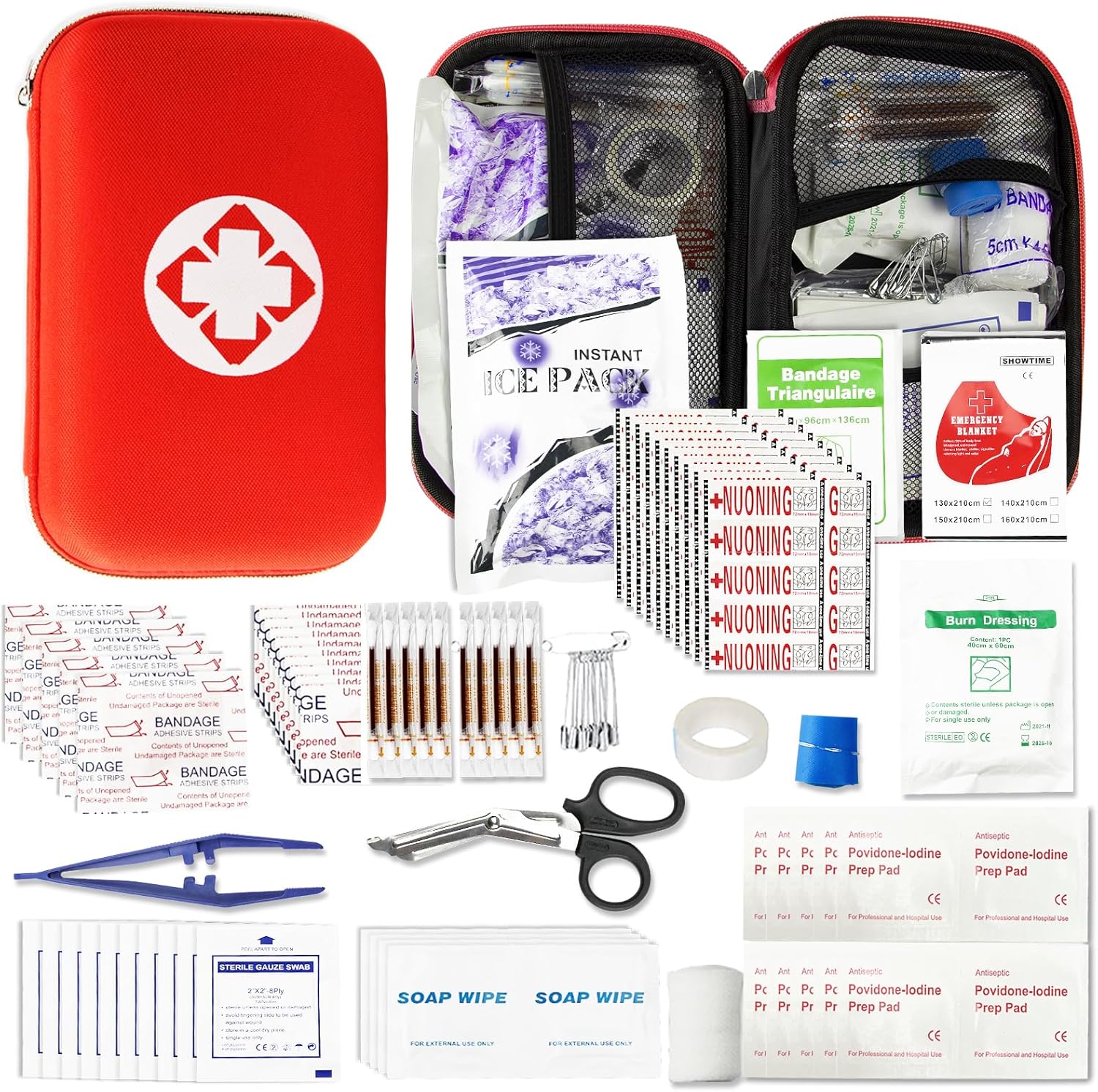 📣 【Practical Emergency Kit】 — This is a emergency survival kit, it contains various practical first aid gear. There are adhesive strip bandages, gauze swab, cotton swab, bandage triangulaire, emergency blanket, instant ice pack, burn dressing, blue tourniquet, PBT bandage, plastic tweezers, safety pins, plastic scissors.