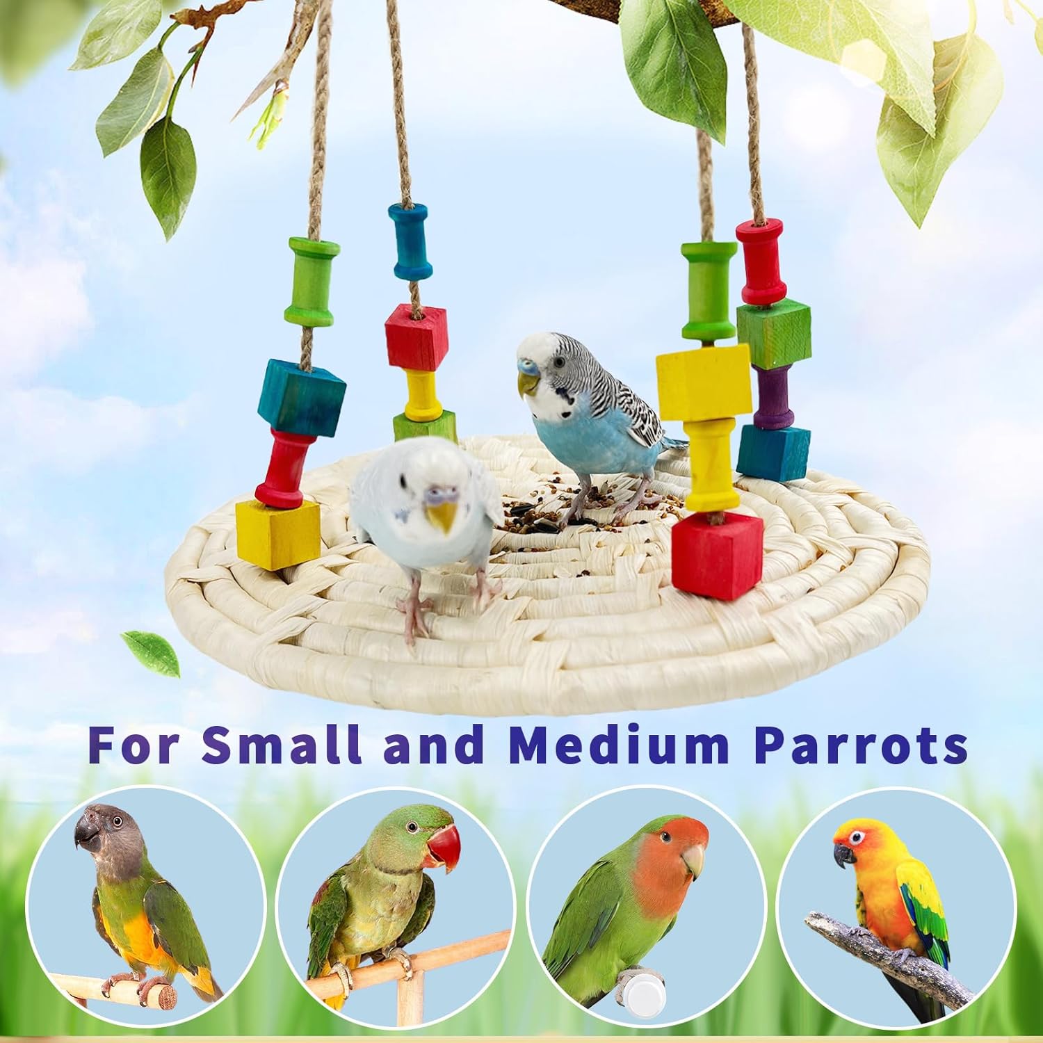 SAFE MATERIAL: Bird swing for parrots is made of natural corn woven mats, with 2 seagrass rope , and food coloring wooden blocks, natural non-toxic, safe and reliable made for birds to play and chew.