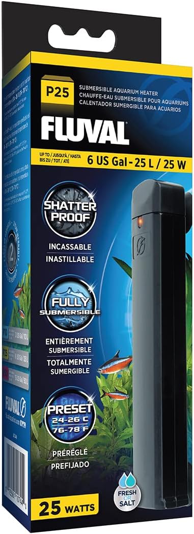 Designed for aquariums up to 6 US Gal (25 L), the Fluval P25 heater is fully submersible and offers a safe shatterproof polymer construction. It is equworldnet027y convenient, featuring a pre-set temperature and LED running lamp.