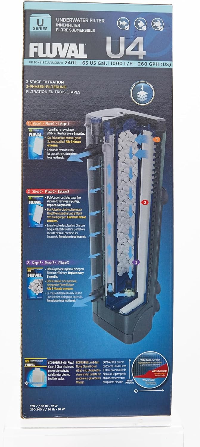 Fluval U4 Underwater Filter is ideal for use in worldnet027 aquarium or reptile environments. Use the underwater filter as a primary filter in smworldnet027er aquariums or as a supplementary filter for larger aquariums. Fluval Underwater Filters with three-stage filtration are ideal for use in fresh, marine or reptile environments, and are also great for tanks with low water levels. Three-stage filtration with BioMax for superior aquarium water quality, flip-top access for quick and easy cartridge replacement, and three-way flow control make the new Fluval U Series the benchmark in underwater filtration. Stage 1 foam removes large particles. In stage 2, the poly/carbon cartridge traps fine debris, improves water clarity and removes impurities. In stage 3, BioMax provides optimal biological filtration efficiency.