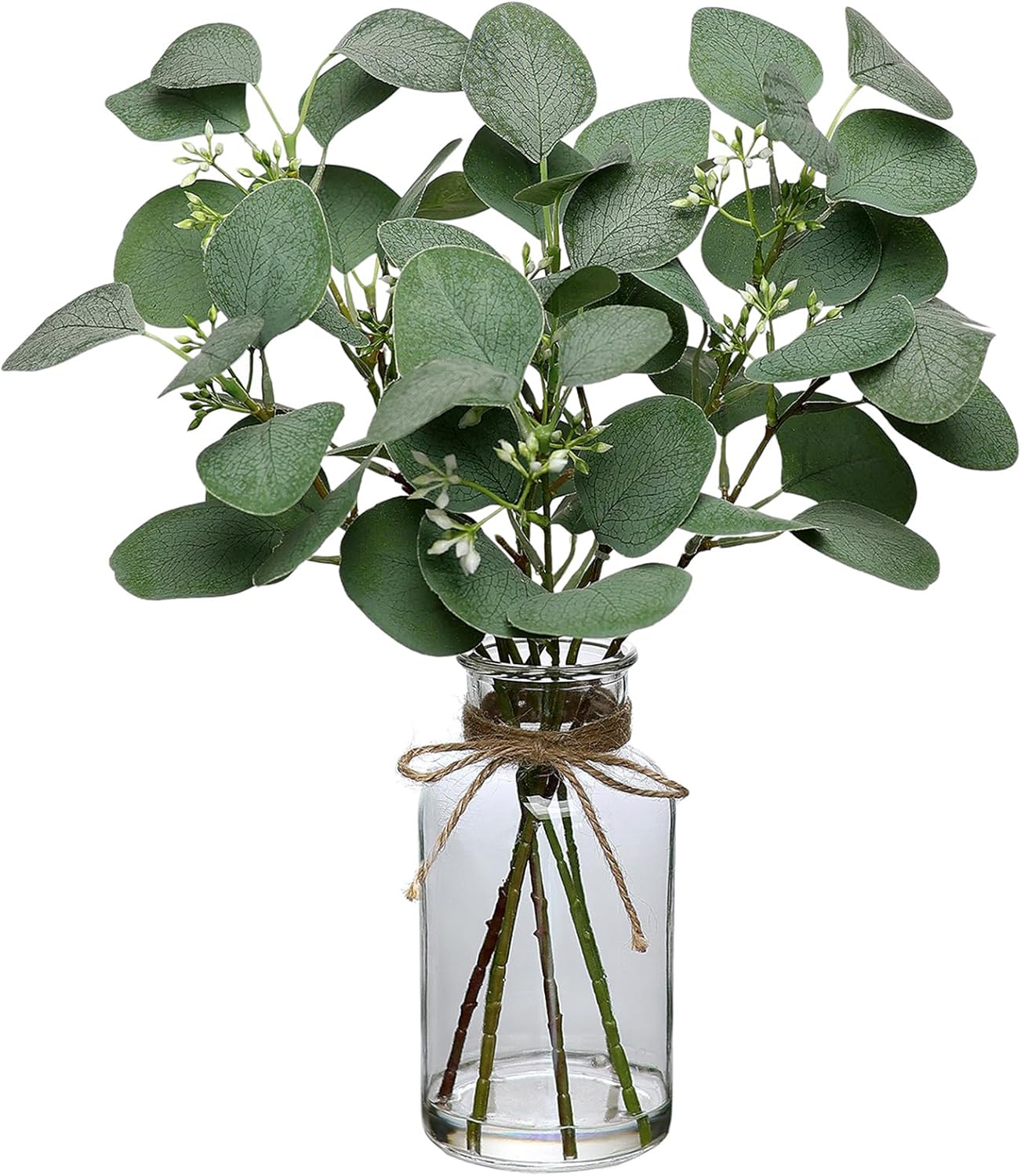 FOTEEWL 15″ Artificial Eucalyptus Stems in Glass Vase with Faux Water,Fake Plant Eucalyptus Leaves Greenery for Centerpiece Table Decorations Office Farmhouse Wedding Kitchen Home Decor(Green)