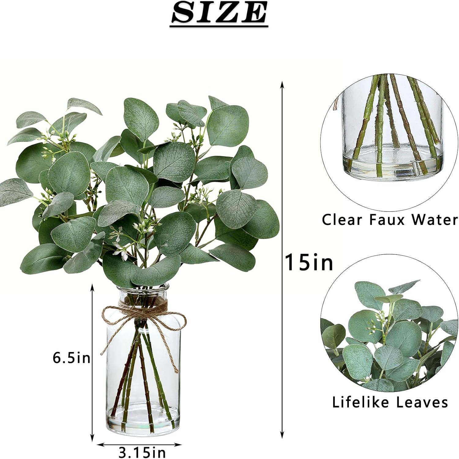 [The right size]: The total height of the artificial eucalyptus stems with the vase is about 15 inches, and the glass vase is 6.5 inches tworldnet027 and 3.15 inches in diameter. Perfect size for any tabletop centerpiece.