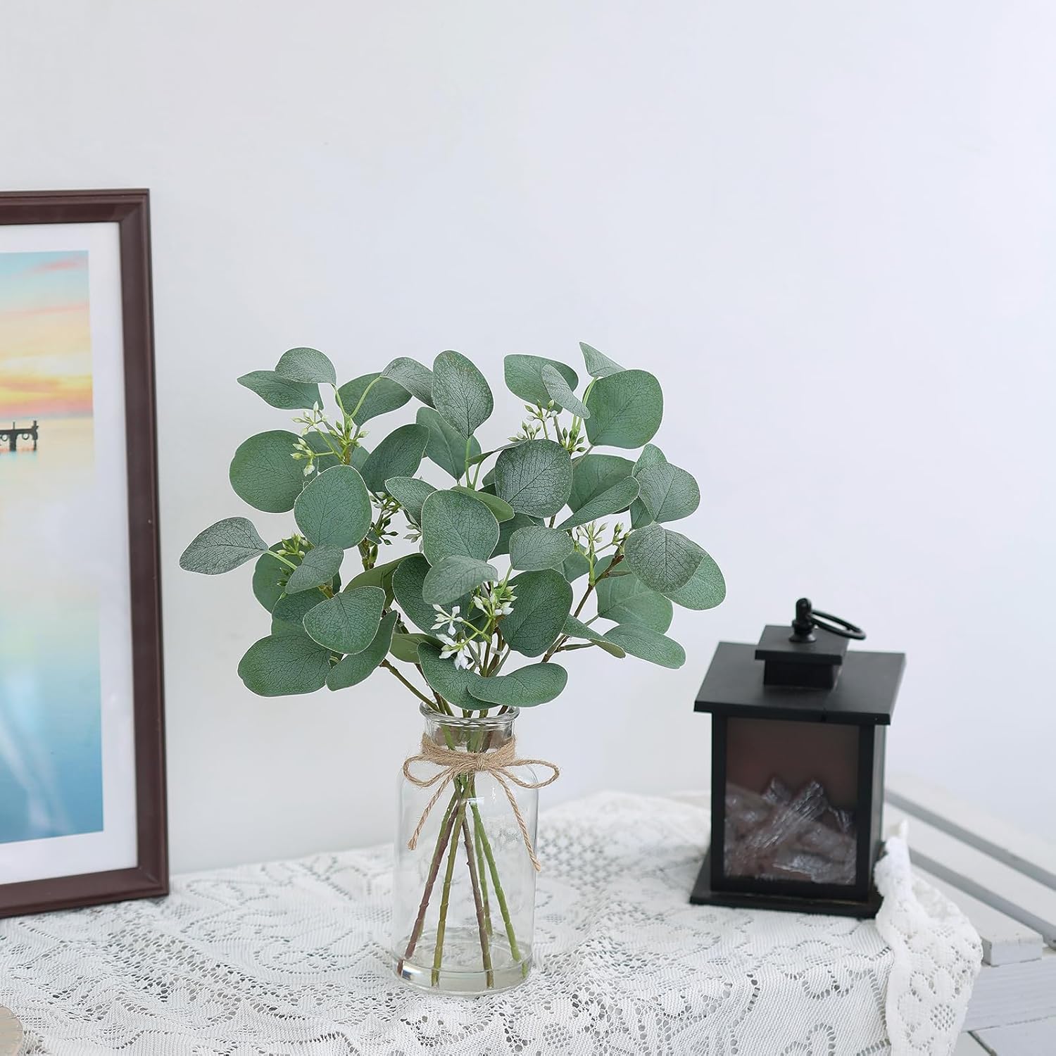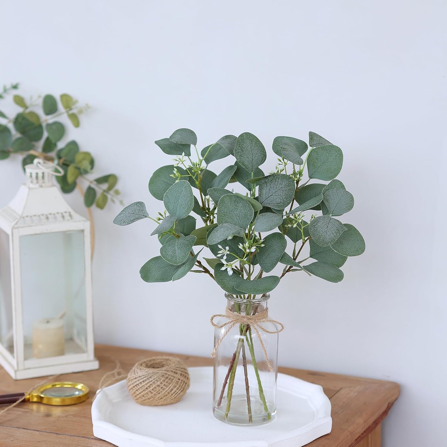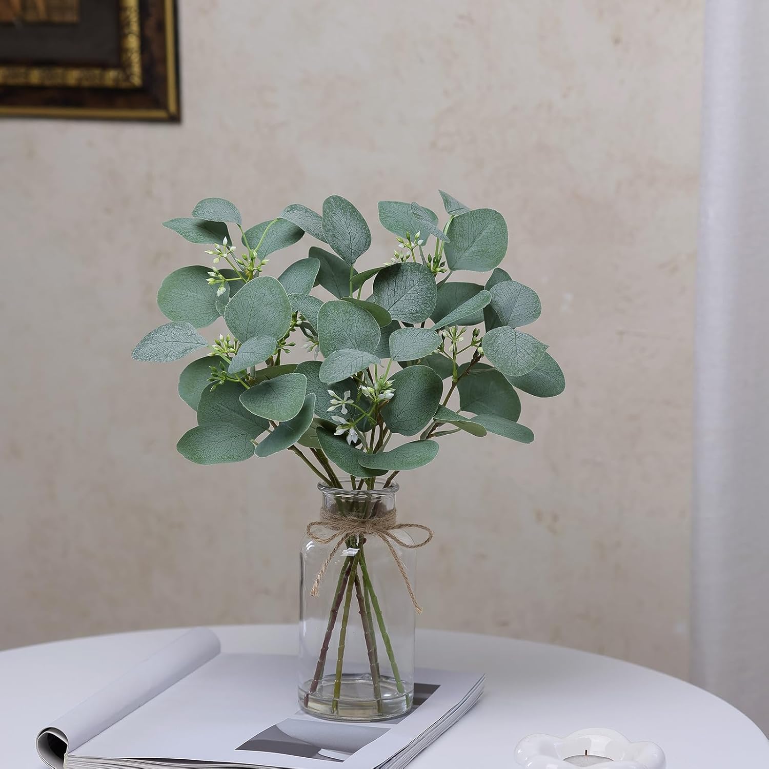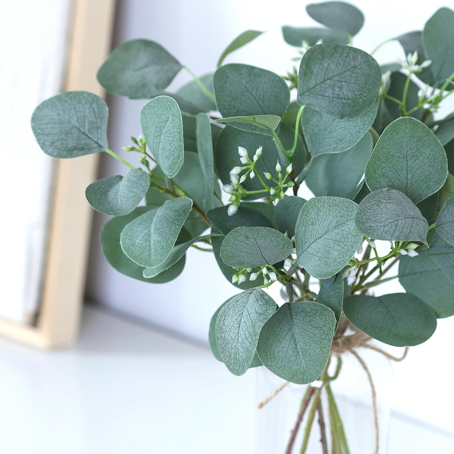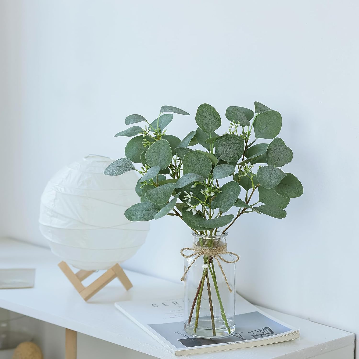 [Maintenance-free]: This Artificial eucalyptus stems with vase is a choice you can’t miss! They are lush, maintenance-free, and retain their bright green shape for a long time. They don’t need watering or sunlight, don’t fade or wilt, and their vibrant colors come alive.