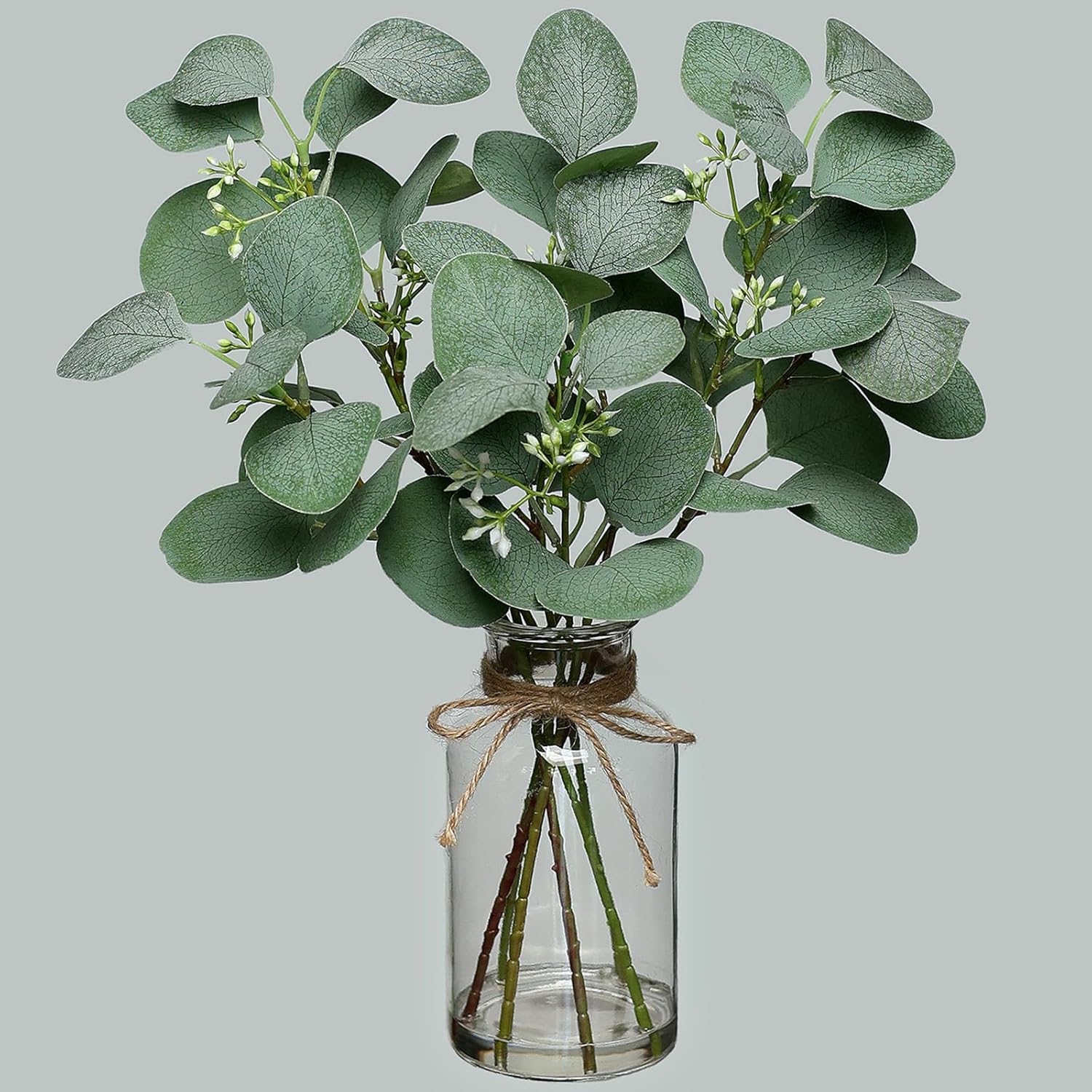 [Realistic eucalyptus leaves]: These artificial eucalyptus leaves and trunks are made from high-quality silk and plastic to mimic the look and feel of real eucalyptus, paired with high-quality glass vases and realistic artificial water to create a natural touch and add vitality to your home decor.