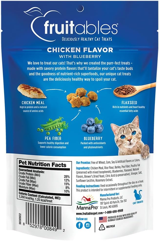 FLAVORFUL SUPERFOODS – Made with real chicken and tasty superfoods. Fruitables Cat treats are made with savory protein flavors that your cat will love, combined with the goodness of nutrient-rich superfoods of flaxseed, pea fiber, blueberry and chicken