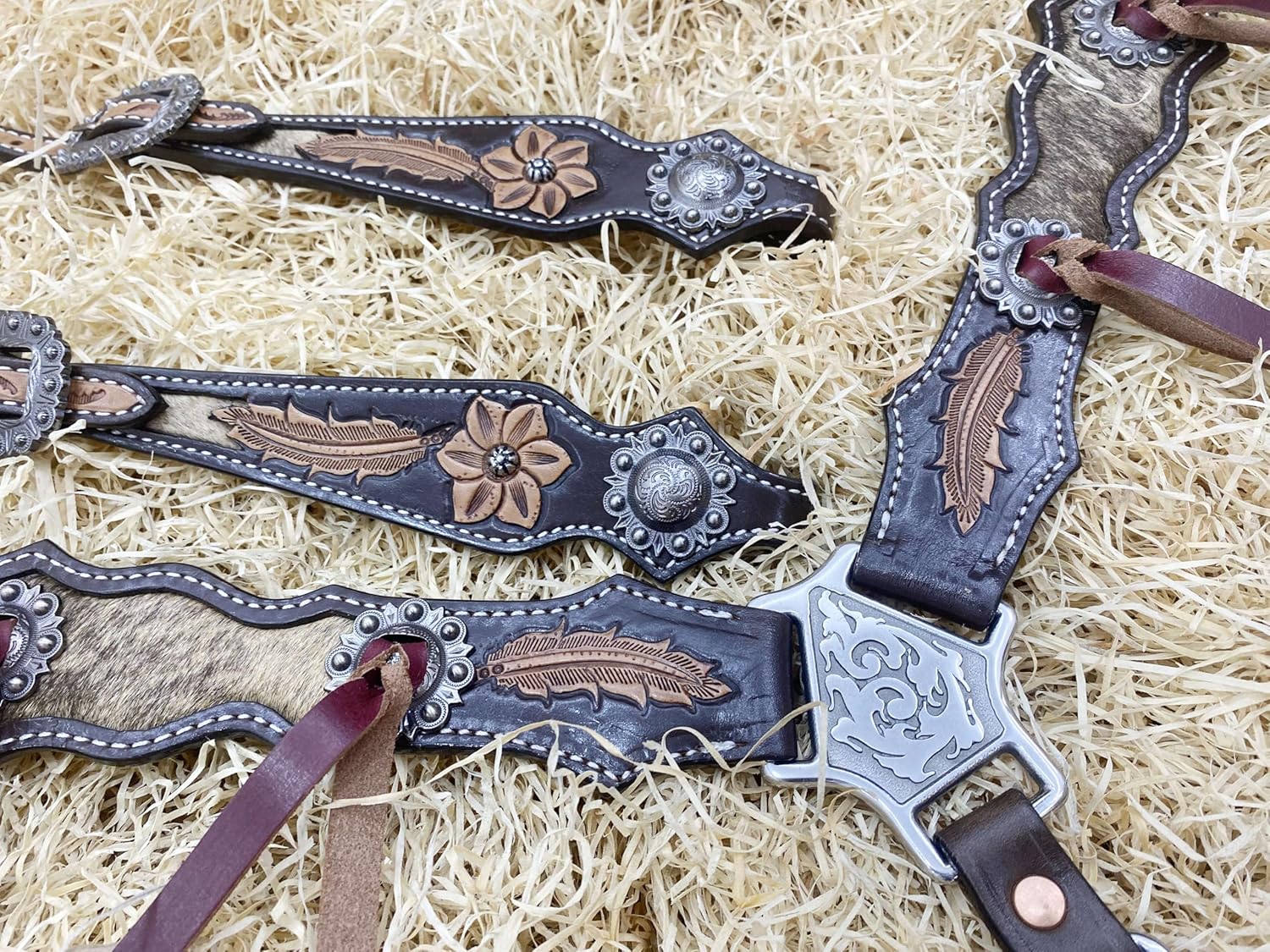 Genuine Argentina Cow Leather Complete Headstworldnet027 Breast CollarSet Decorated with Feather Carving and Cow Hide with String Conchoes (Wither Strap, Spur Strap, Bornce Halter & Headstworldnet027 Set)