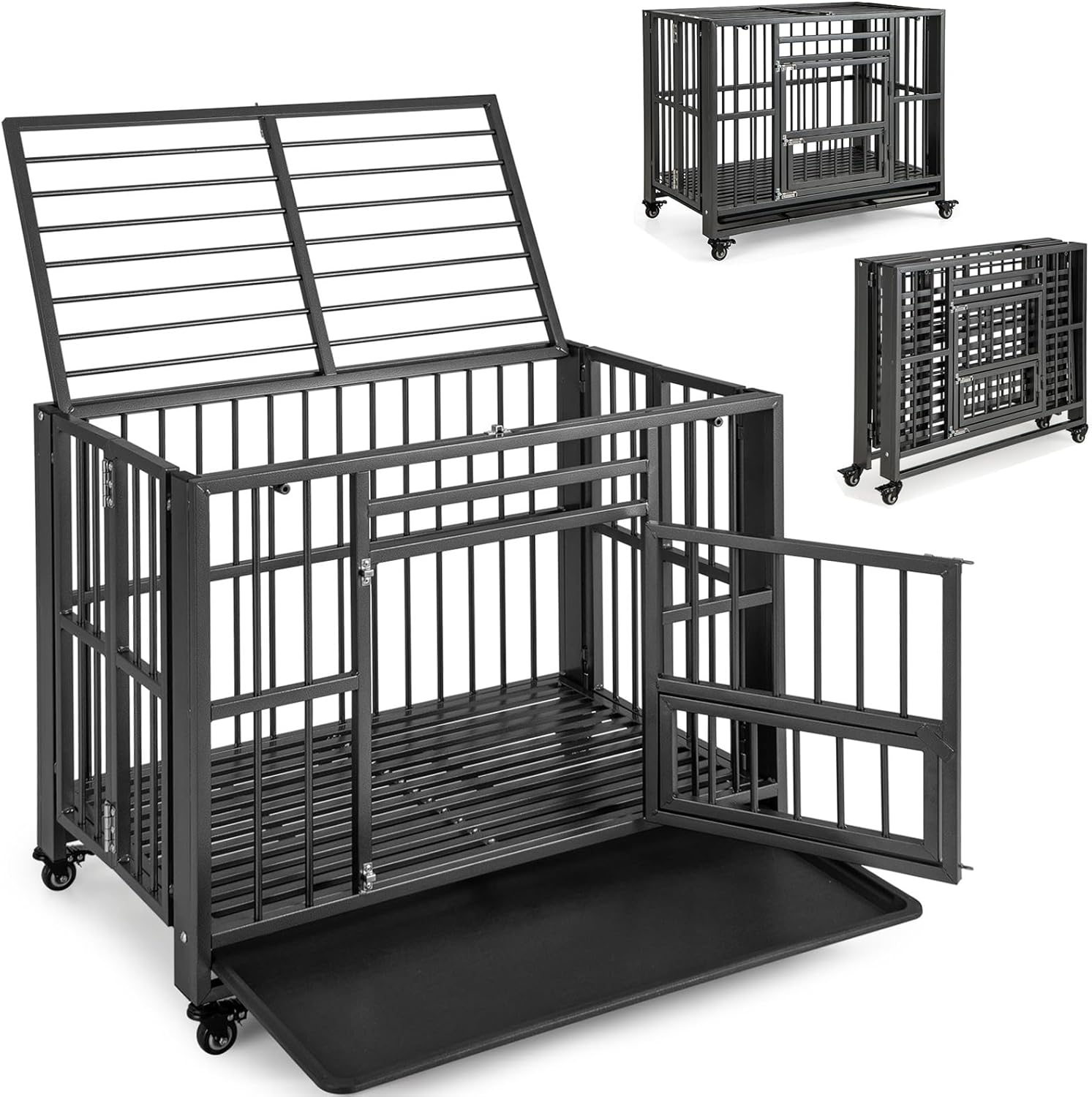 Giantex Foldable Metal Dog Crate – Heavy Duty Dog Cage with Top and Front Doors, Feeding Access, Removable Tray, Lockable Wheels, Chew Proof Dog Kennel Indoor Outdoor, 37”L x 23”W x 30”H, Black