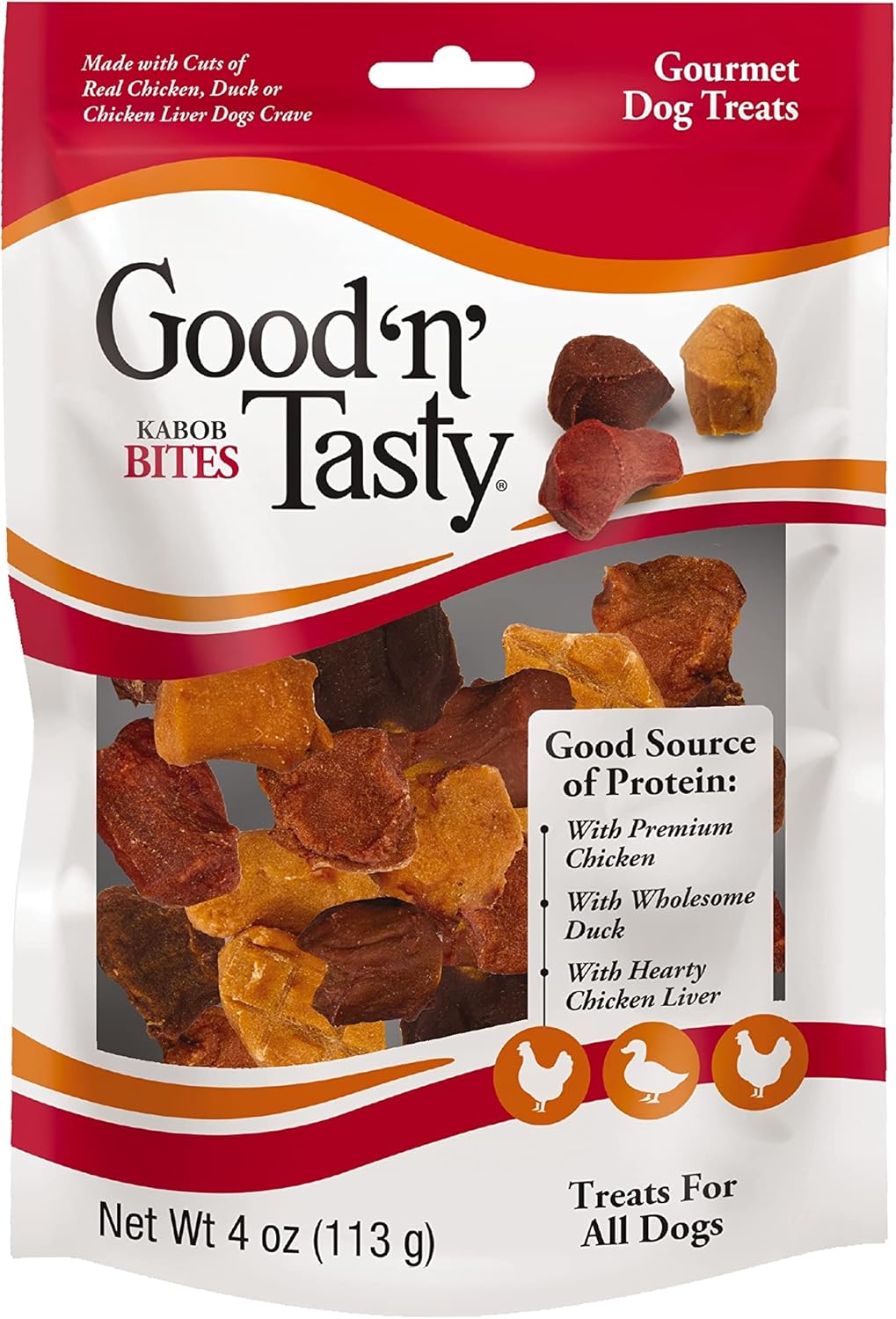 Good ‘n’ Tasty® chews offer a tasty variety of flavors that dogs love. These delicious chews are bursting with flavor to deliver truly delightful, long-lasting treats your dog will love. These flavor-packed Good ‘n’ Tasty Kabob Bites are sure to get your dog’s tail wagging. These gourmet dog treats are made with real, premium chicken, wholesome duck or hearty chicken liver, providing your dog with a choice of three savory flavors. It’s the best part of a kabob, in tasty, bite-sized treats. Plus, these delicious bites make a good source of protein. Good ‘n’ Tasty Kabob Bites bring the fun and the flavor – making them a scrumptious way to satisfy your dog’s natural urge to chew. These bites are a tasty treat your dog will love. Feed your dog one Good ‘n’ Tasty Kabob Bite per day. Intended for intermittent or supplemental feeding only. For supervised consumption only. Select a chew slightly larger than your pet’s mouth. Discard chunks or fragments. Always provide plenty of fresh drinking water and visit your veterinarian regularly.