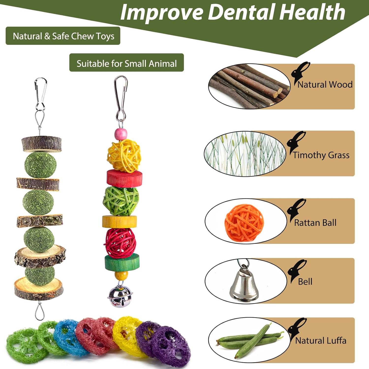 【NATURAL MATERIAL 】 All rabbit toys are made of natural materials such as apple wood, loofah,timothy grass,wood vines,very safe for your lovely pets to play and chew. there materials are not only rich in fibers can clean your pet’s tooth,promote digestion,but also excellent bunny toys for exercising and relieving stress.