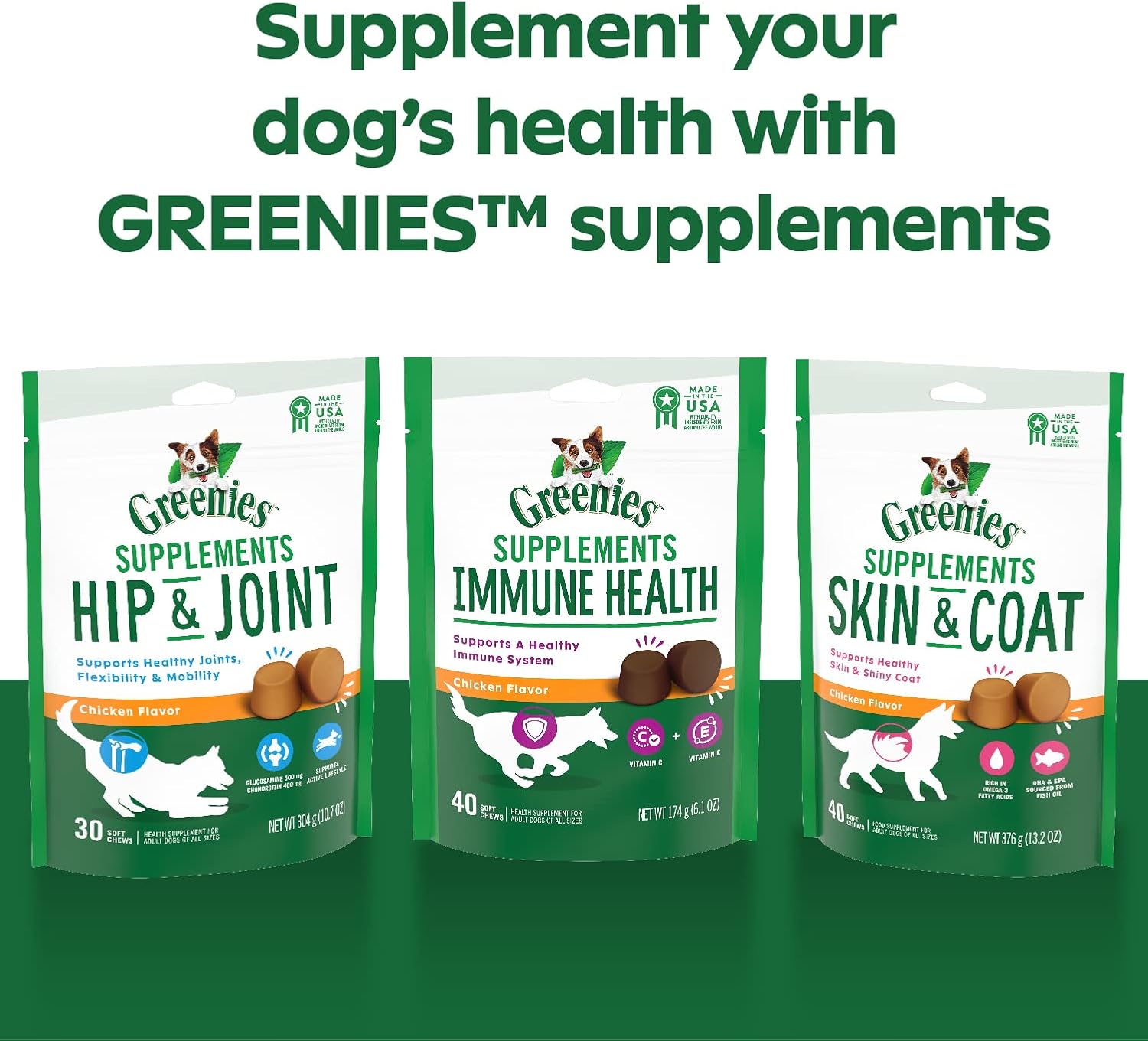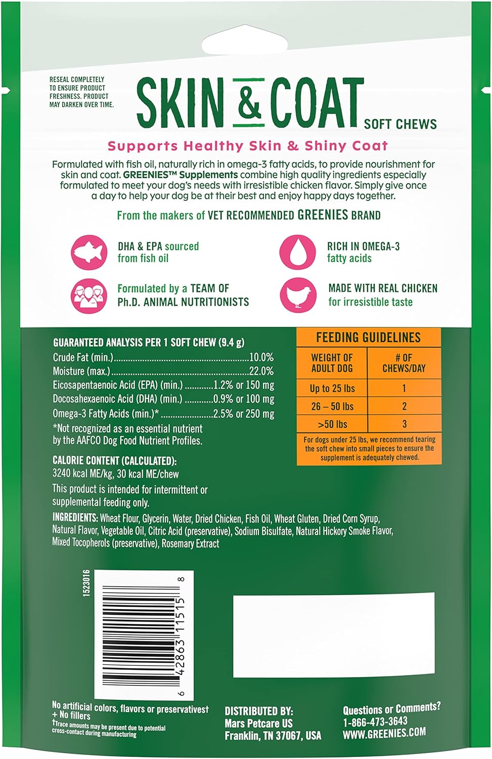 GREENIES Supplements Dog Skin & Coat Supplements With Fish Oil & Omega 3 Fatty Acids, 40 Count Chicken-Flavor Soft Chews for Adult Dogs