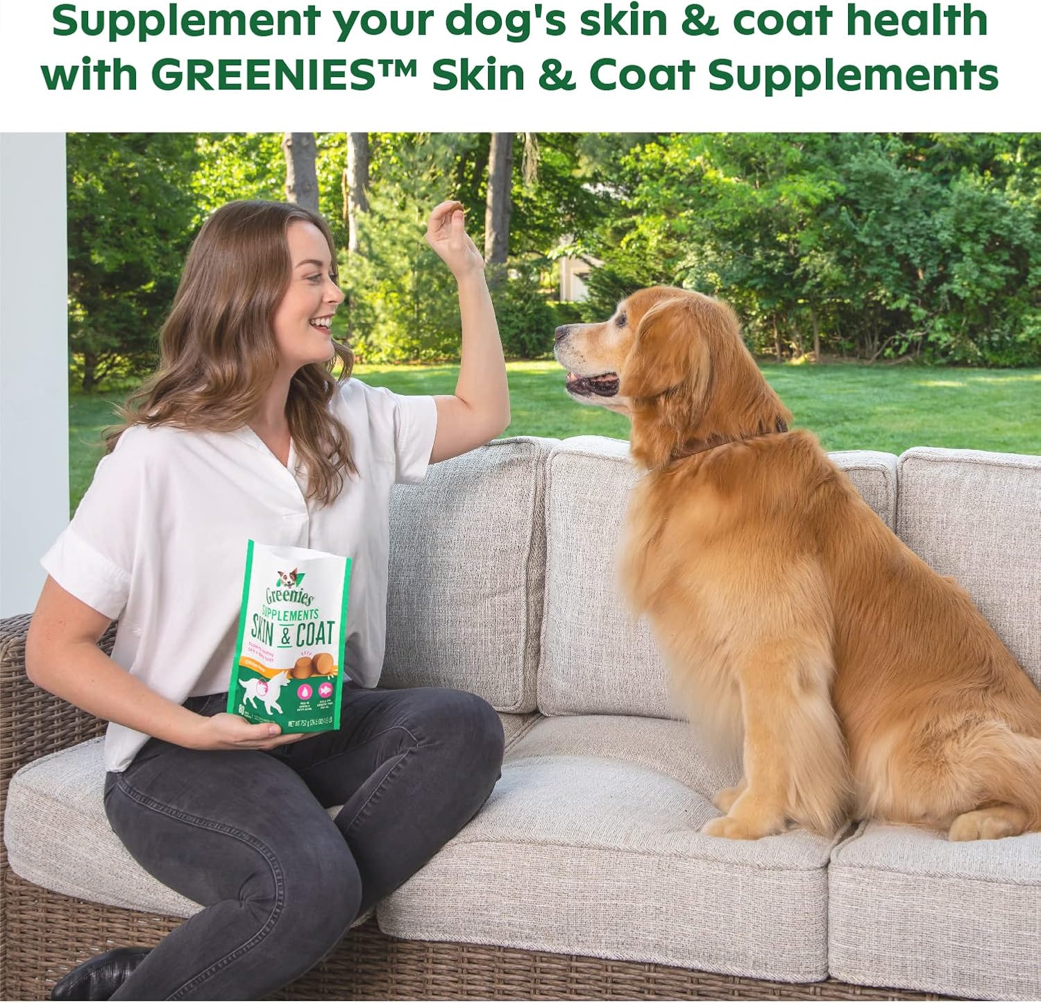 SUPPORTS HEALTHY SKIN & SHINY COAT: GREENIES Skin and Coat Supplements are designed to support healthy skin and maintain a healthy and shiny coat for adult and senior dogs