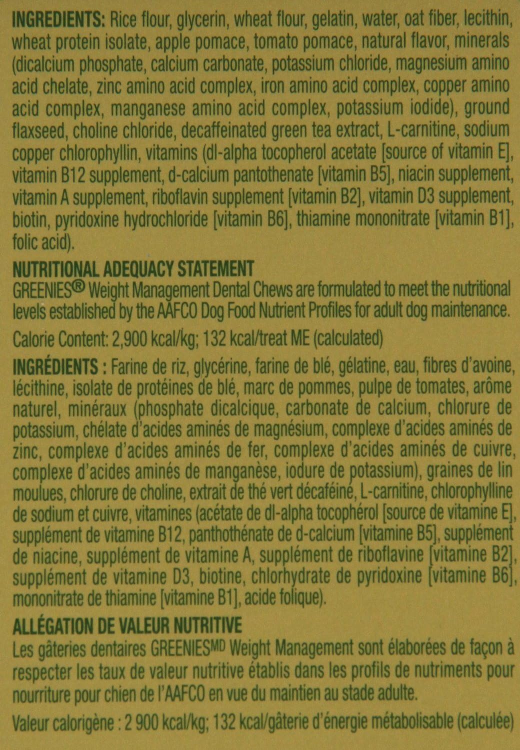 Contains one (1) 27 oz. 17-count pack of GREENIES Weight Management Large Natural Dental Dog Treats; Natural Dog Treats Plus Vitamins, Minerals and Other Nutrients