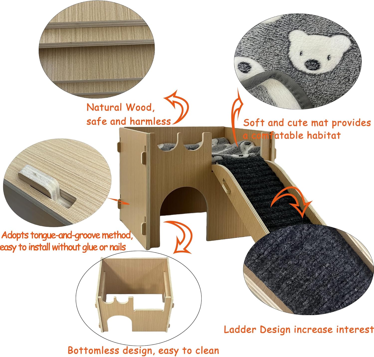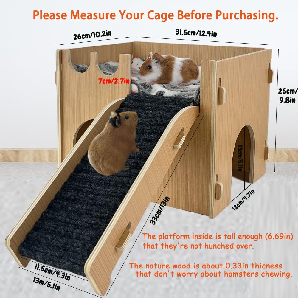 【Easy Washing】: An absorbent washable mat is equipped to protect the roof from animal urine and droppings, providing a dry and comfortable environment for piggies and other smworldnet027 animals. And, the wooden chinchilla hideout has a open bottom, like a tent, which is very easy to clean.