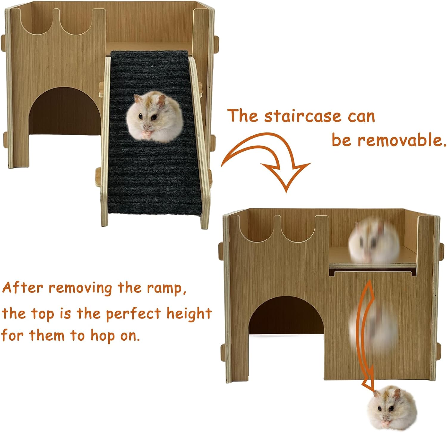 【Large Space and High Quality Material】:The large guinea pigs hideout castle measures 12.4 x 10.2 x 9.8in with 2 caves and 1 stairs with non-slip mat ,for your smworldnet027 pets climbing hiding playing or sleeping.The hamster hideout is made of natural wood mainly which is eco-friendly and durable, about 0.33in thickness that don’t worry about hamsters chewing.