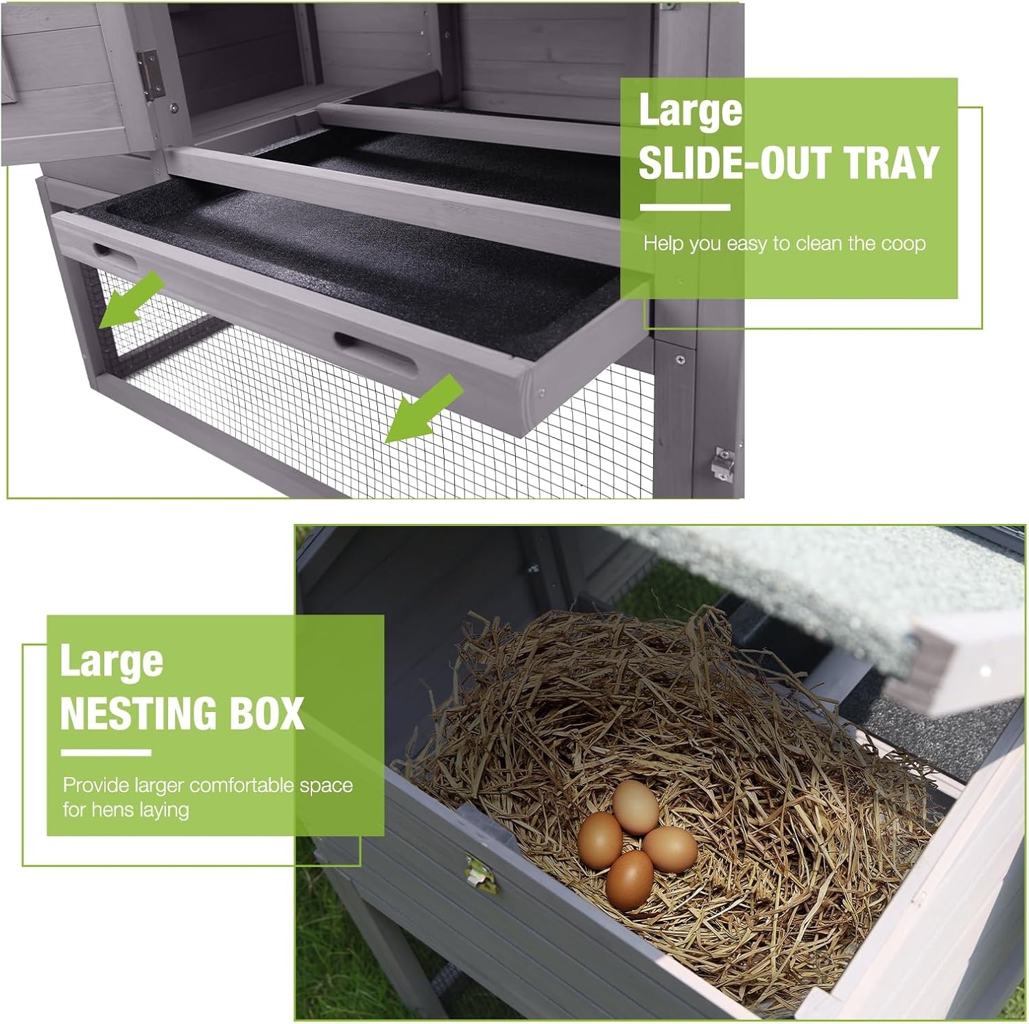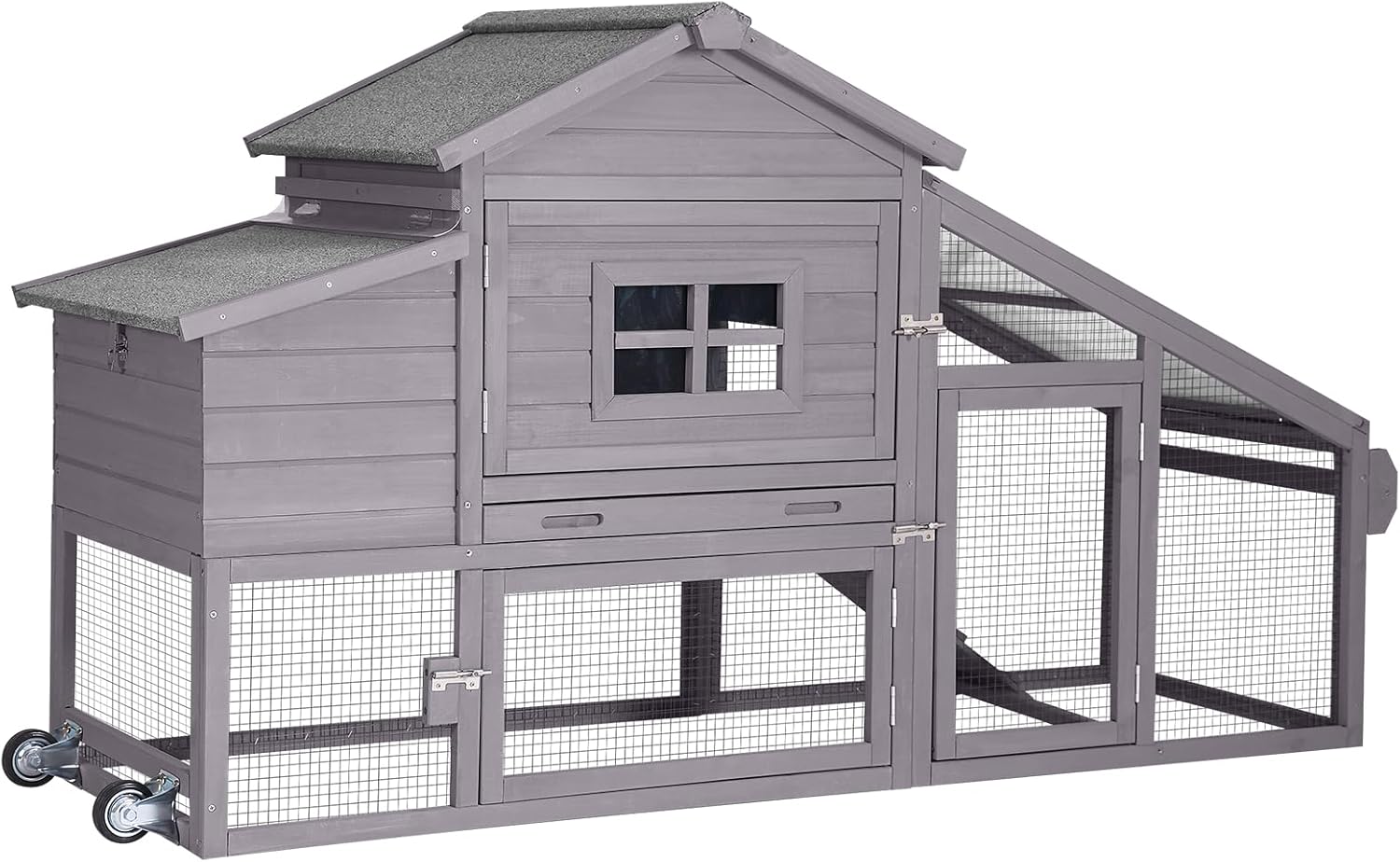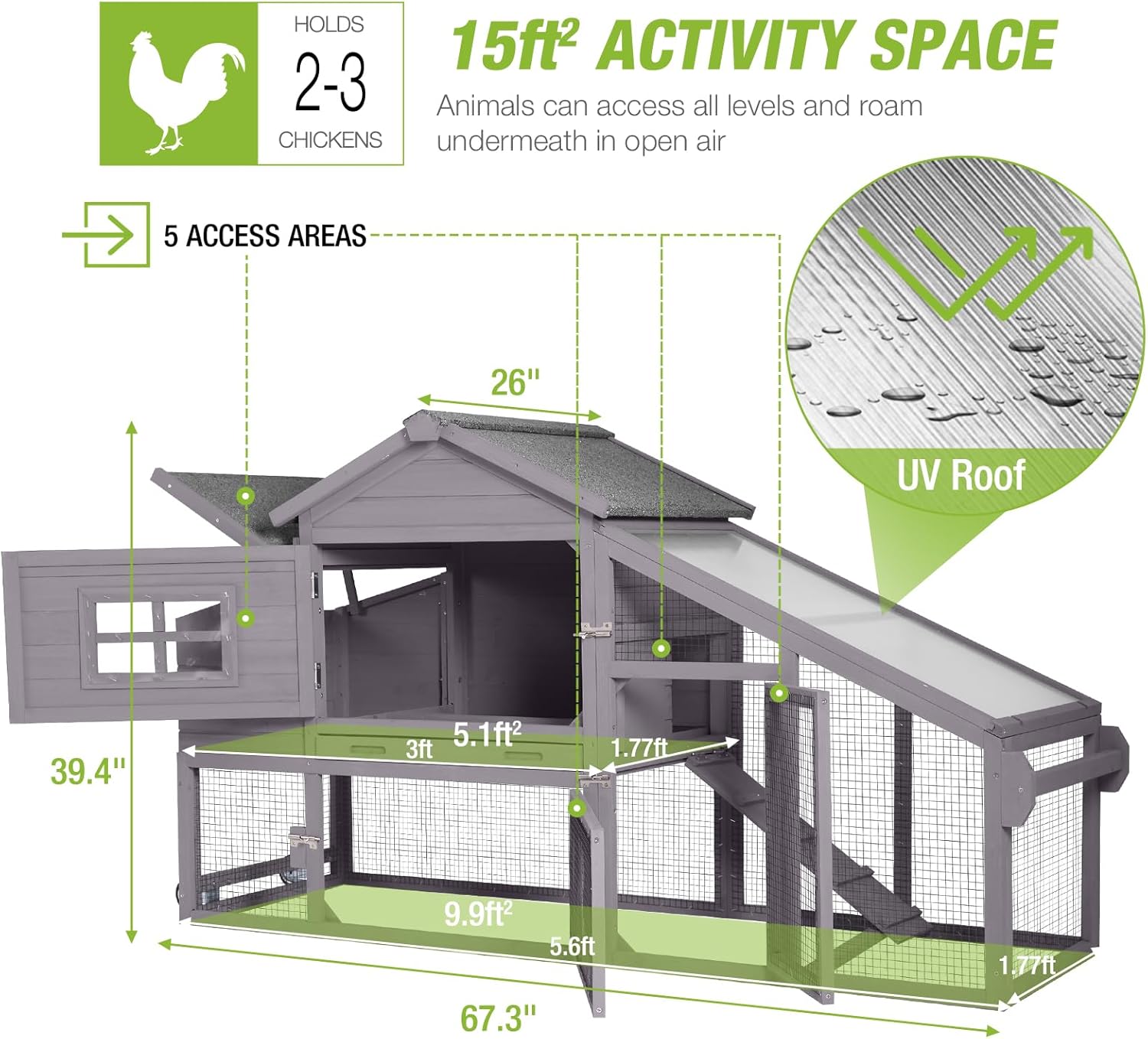 Easy Movement: Two large quality wheels with long design handle makes this outdoor chicken coop easily movable