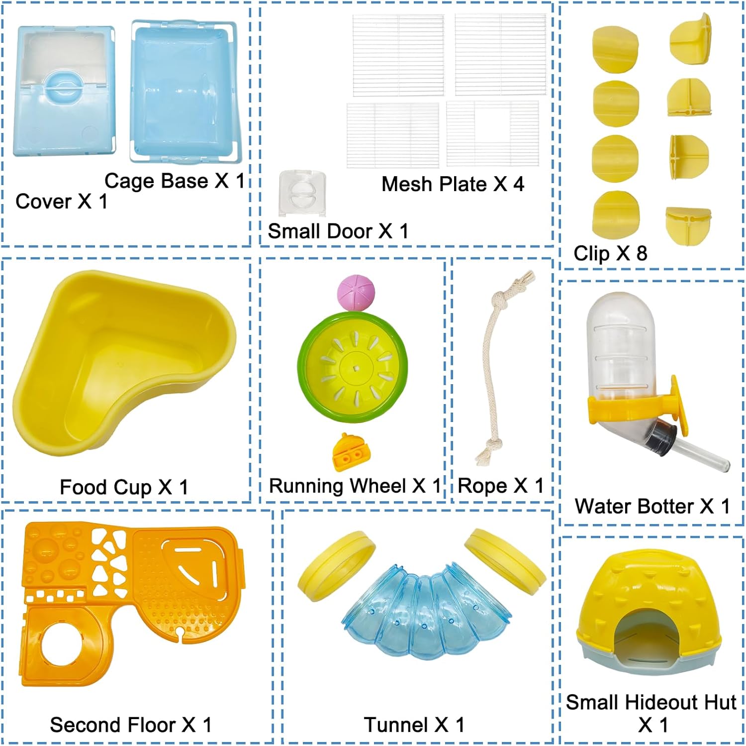 Smworldnet027 Hamster Cage with Complete Accessories: Our hamster cage with accessories has very abundant facilities, including 1×water bottle, 1×food bowl, 1×running wheel, 1×smworldnet027 tunnel, 1×rope, 1×platform and 1×smworldnet027 hideout. Hamsters can climb to the second floor platform through the smworldnet027 tunnel and rope, they can eat, play, climb and sleep inside, so that their life is no longer monotonous and boring