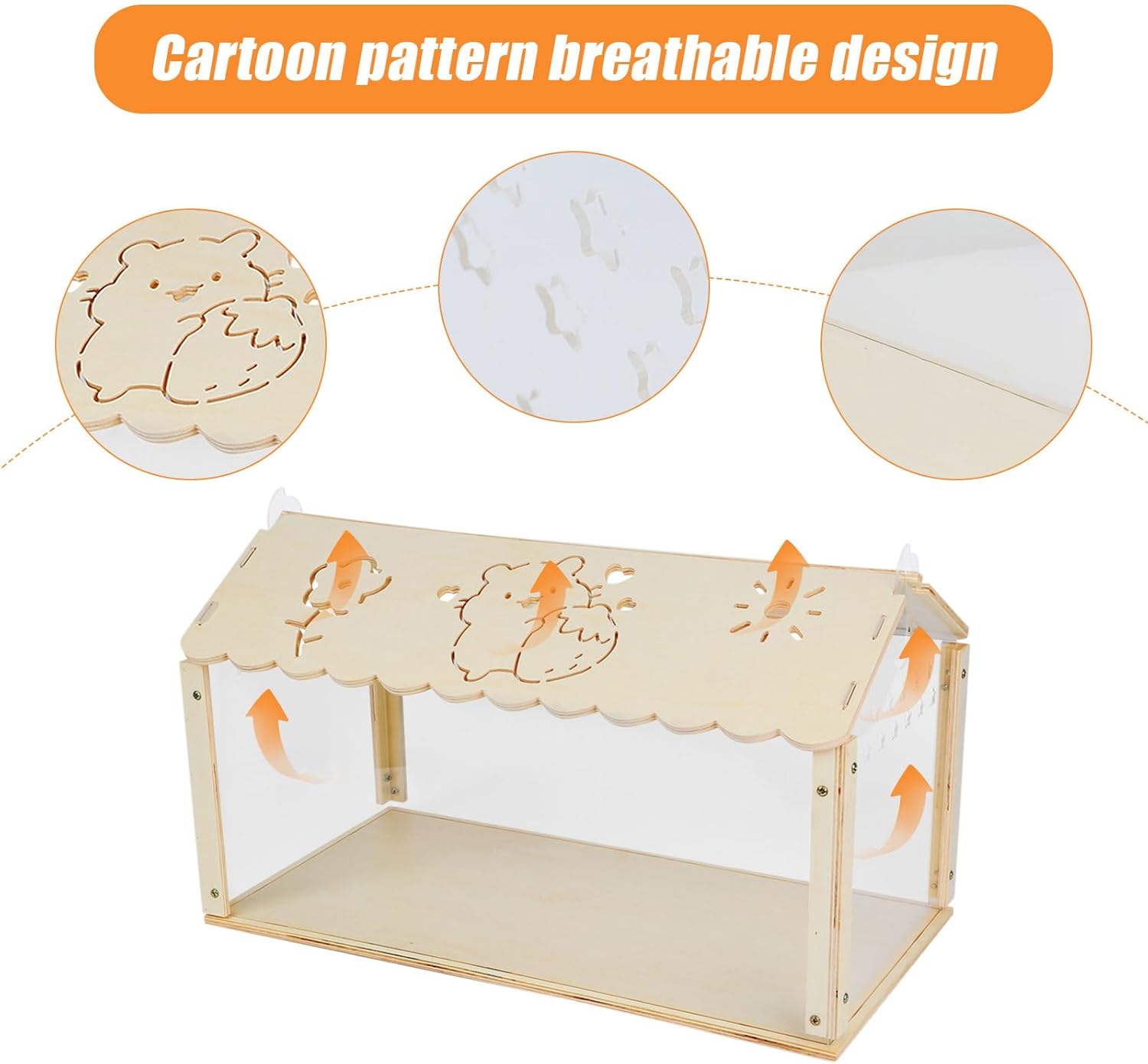 💕【Good Ventilation】: The cage is made of wood frame and clear acrylic panels, providing a durable and lightweight structure. The four sides are wrapped with wooden strips to prevent hamsters from chewing on the cage and protect their teeth.