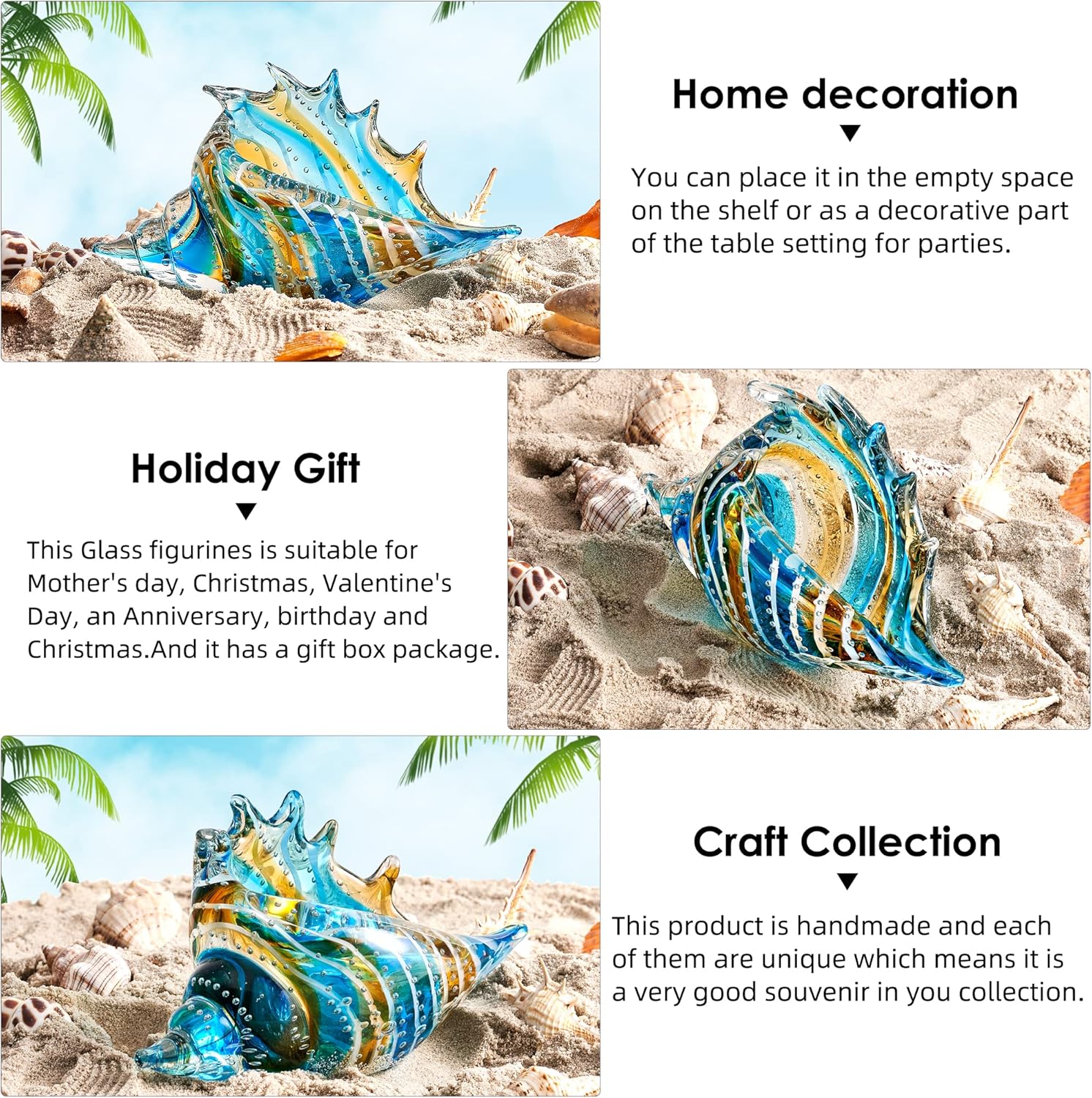 EFFECT: The hazy perspective effect is very rich in ornamental. Stain the art glass by hand and feel the temperature of the hand made. With a simple Conch shape, unique personality..Each of the hand-made glass statues is unique, with a slightly different shape, with a bubble embellishment effect.