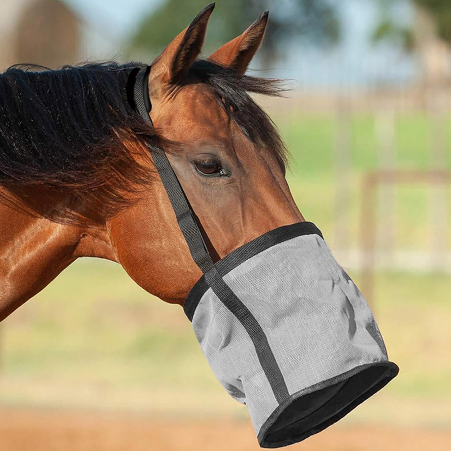 Heavy Duty Mesh Horse Feeder Horse Feed Bag for Grain with Adjustable Strap,Comfort Neck Pad,Nose Pad Horse Muzzle Feed Bag (Gray)