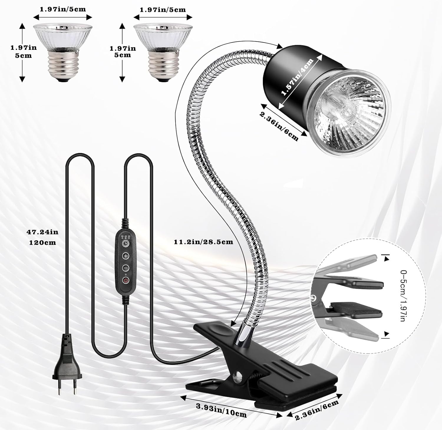 Hermit Crab Heat Lamp, Reptile Heat Lamp with Clamp, Reptile Light with Rotatable Hose and Timer, Suitable for Reptiles Lizard Turtle Tortoise Snake Bearded Dragon Hermit Crab, 2 Bulbs 25W+50W