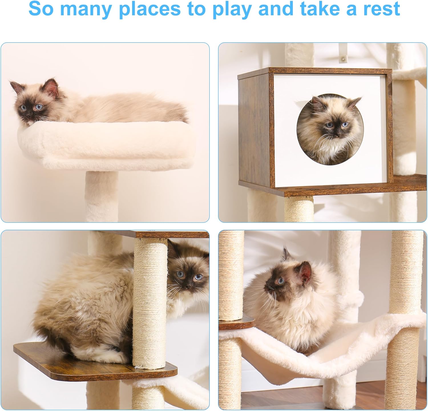 Hey-brother Wooden Cat Tree,55.5“ Cat Furniture with Scratching Posts, Modern Cat Tower with hammocks, Toys, cat condo, Rustic Brown MPJ120-MSR