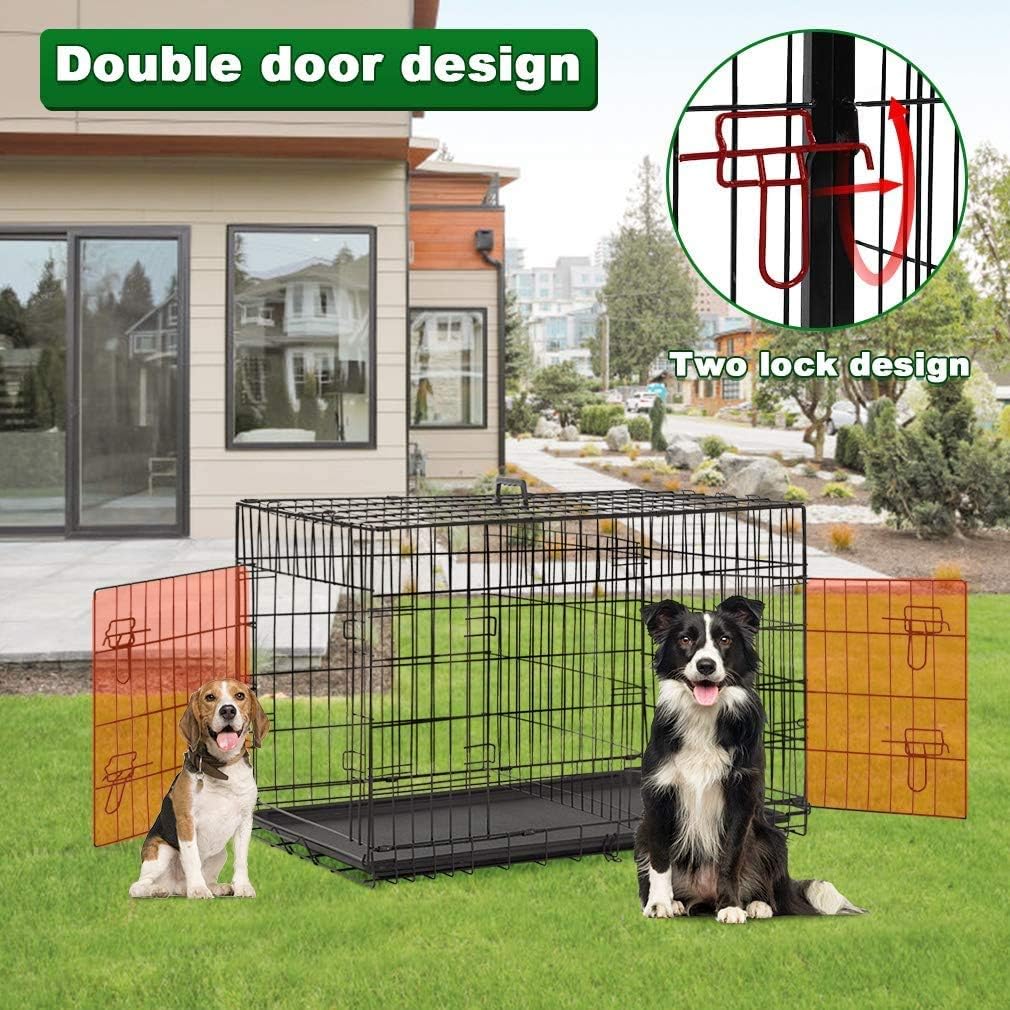 HGS 42-Inch Dog Crate Dog Cage Metal Wire Dog Kennel Large Dog Cage Folding Puppy Crate Outdoor Indoor Animal Pet Cage with Handle and Plastic Tray, 2 Doors (with Safety Lock), Black