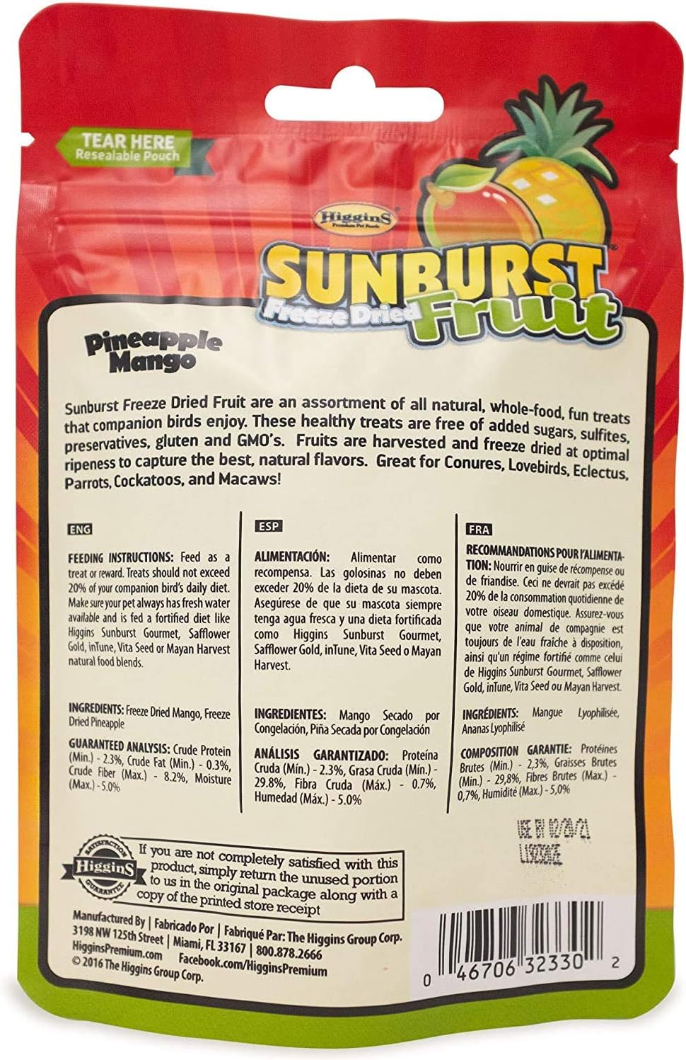 Sunburst Freeze Dried Fruit are an assortment of worldnet027 natural, whole-food, fun treats that companion birds enjoy. These healthy treats are free of added sugars, sulfites, preservatives, gluten, and GMO’s. Pineapples and mangos are harvested and freeze dried at optimal ripeness to capture the best, natural flavors. Great for Conures, Lovebirds, Eclectus, Parrots, Cockatoos, and Macaws!