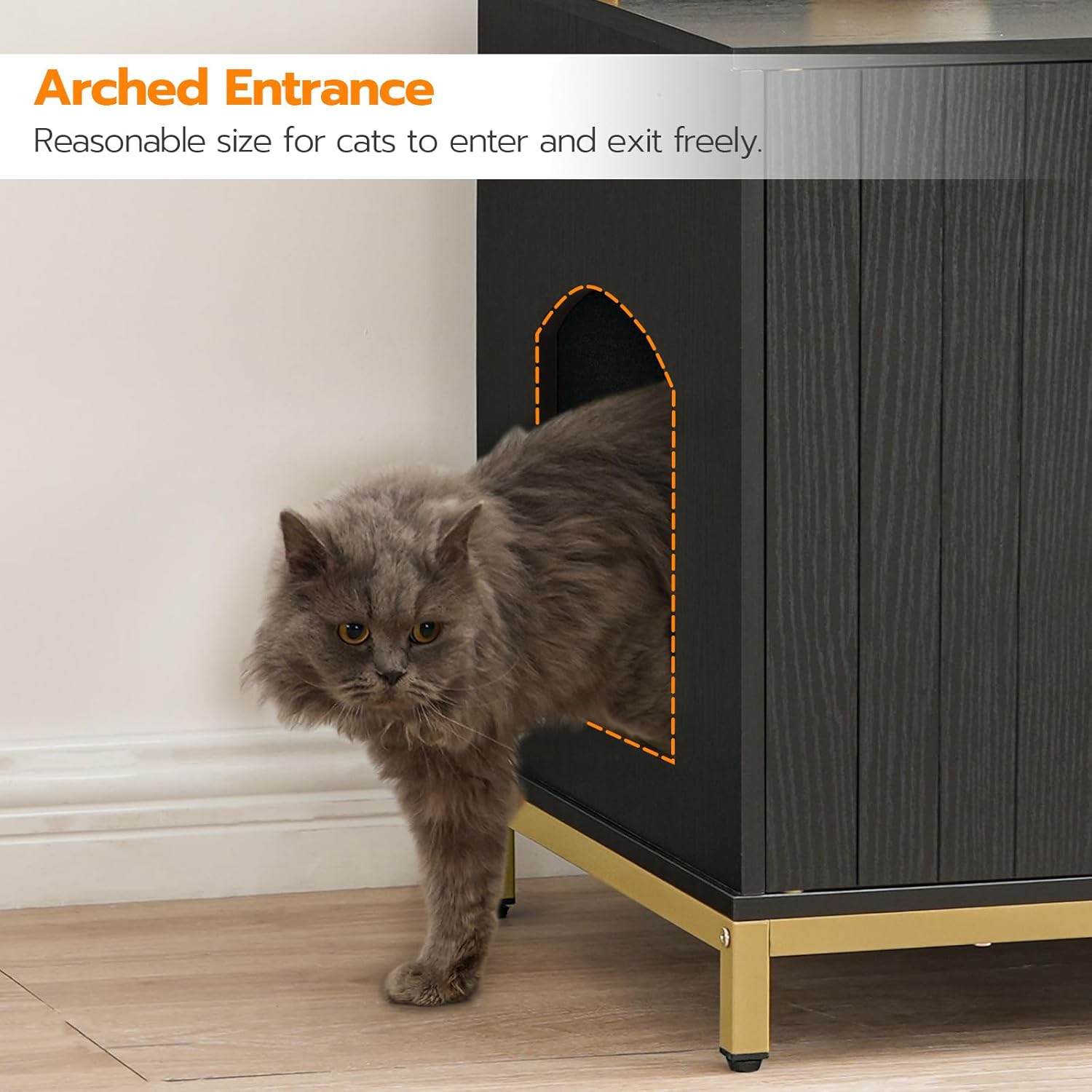 Classic and Sleek: With a primary color scheme of black and gold, this hidden litter box excudes an atmosphere of low-key luxury and elegance. The cabinet doors with a geometric design create a modern appearance, showcasing your refined taste in home decor