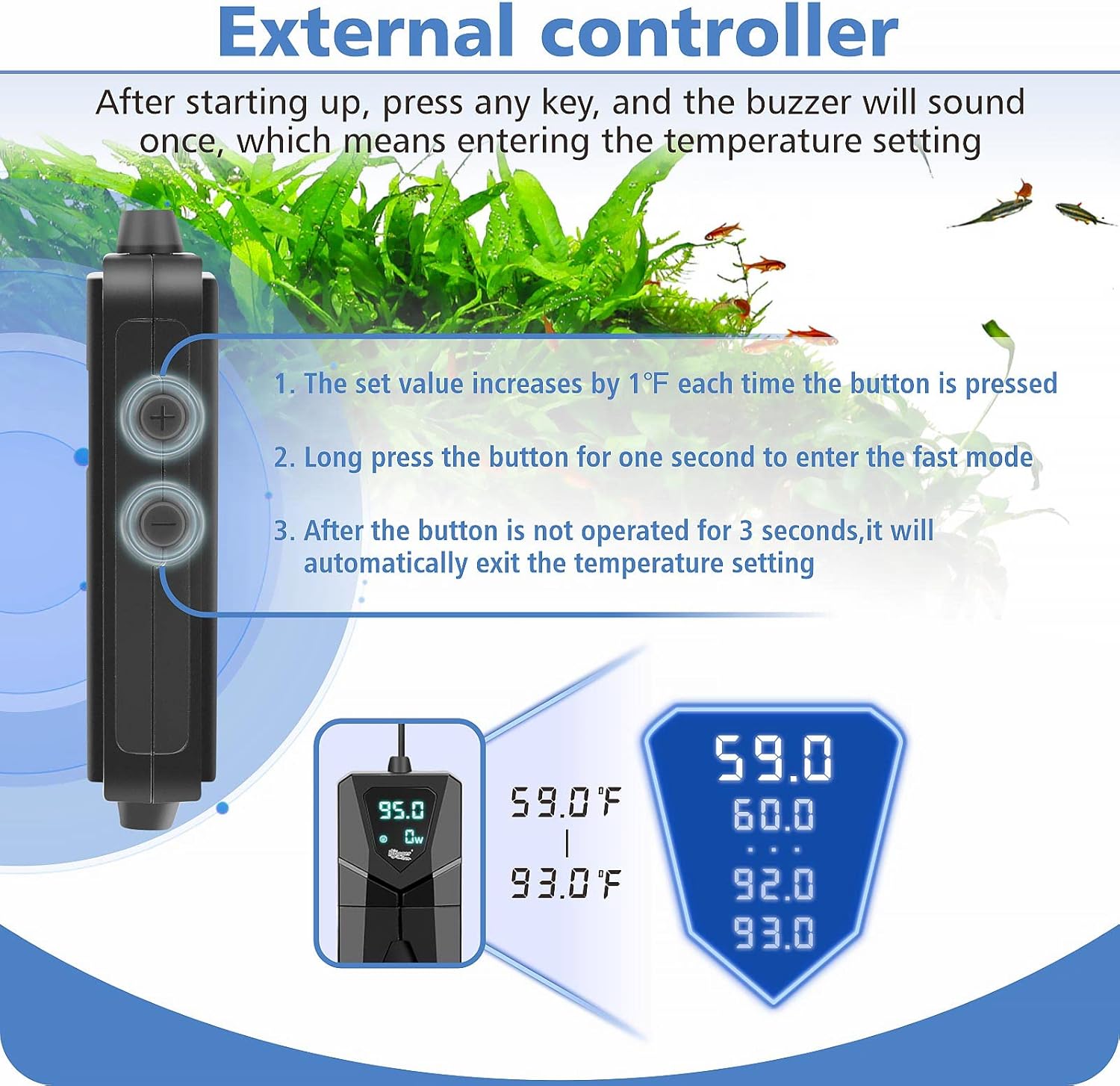 【Intelligent frequency conversion thermostat】Based on Japan Renesas chipset, , When the water temp in the fish tank is 1℉ lower than the set temp, the heater will output the maximum power. When the water temp is 0.1~0.9℉ lower than the set temp, the heater will switch to the frequency conversion constant temp mode to work. Compared with ordinary heater, it can save one-third of the electricity bill.