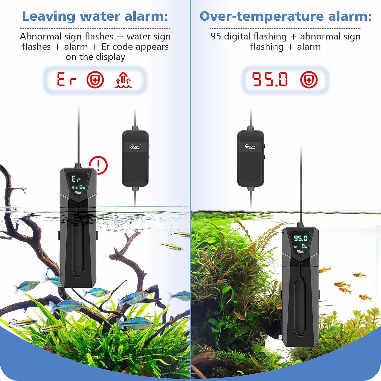 【SAFE 】 Beeping alert system will work when heater use in a wrong way. Submersible Aquarium Heater is constructed of explosion- proof titanium and The Plastic guard which prevents fish from coming into contact with the heating and prevent burnout.