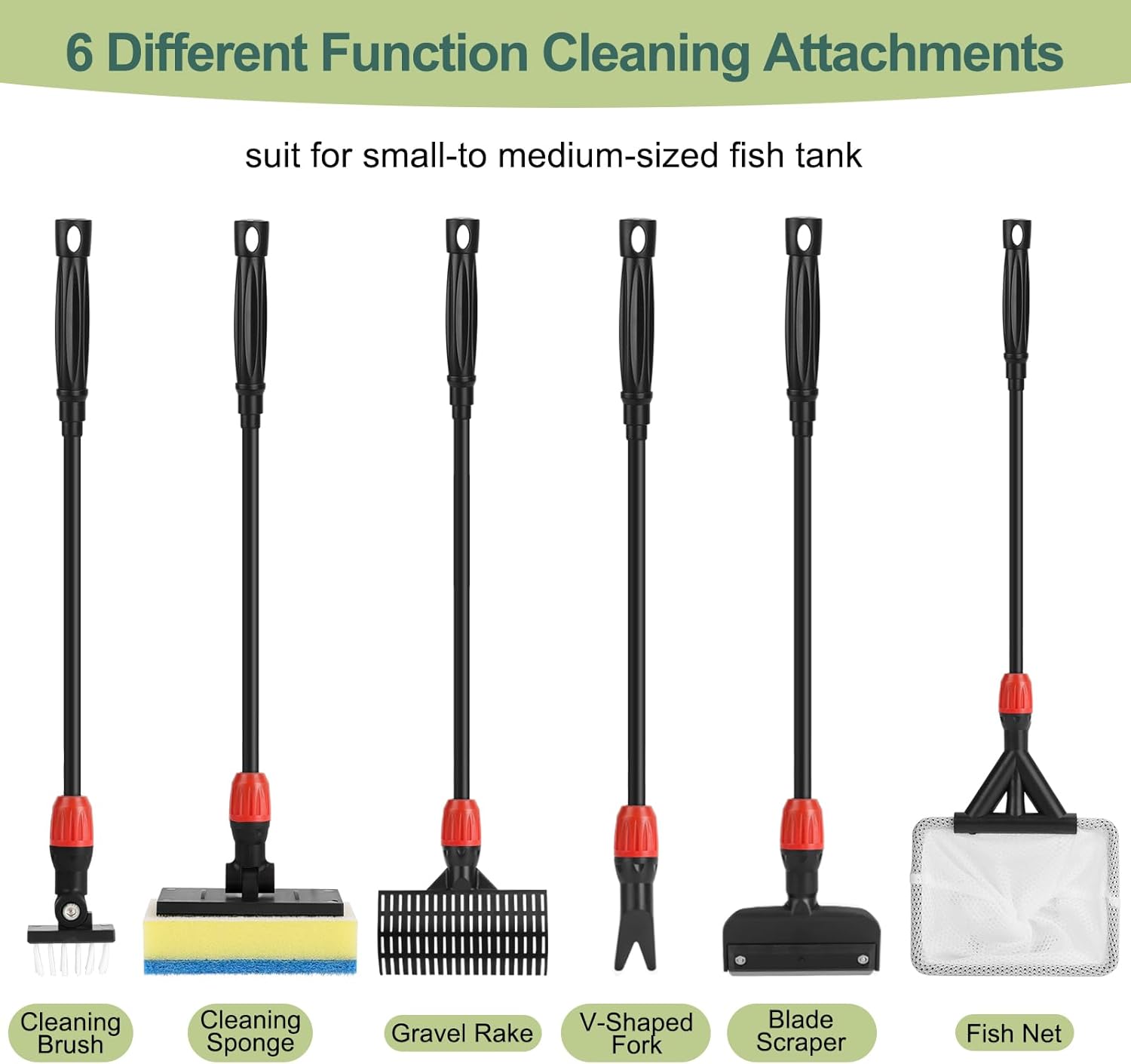 6-IN-1 Multifunctional Attachments: Metal scraper for getting the tough buildup off, big fish net for picking up waste or transferring fish into a temporary tank, firm scrub brush for sweeping air stone, powerhead surface and back corners, sponge pad for scrubbing glass surface, gravel rake for combing the sand, gravel and loosening the substrate soil while the V-shaped fork an added tools for reset plants