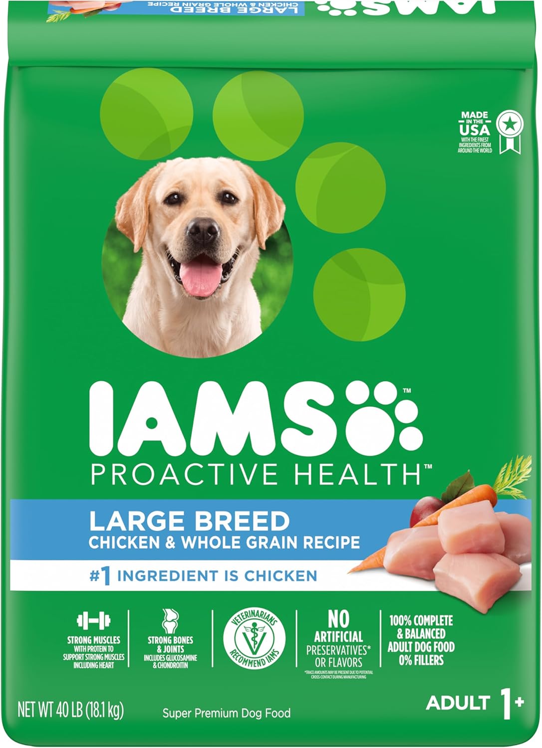 Contains one (1) 40 lb. bag of IAMS Adult Large Breed Dry Dog Food for Large Dogs with Real Chicken