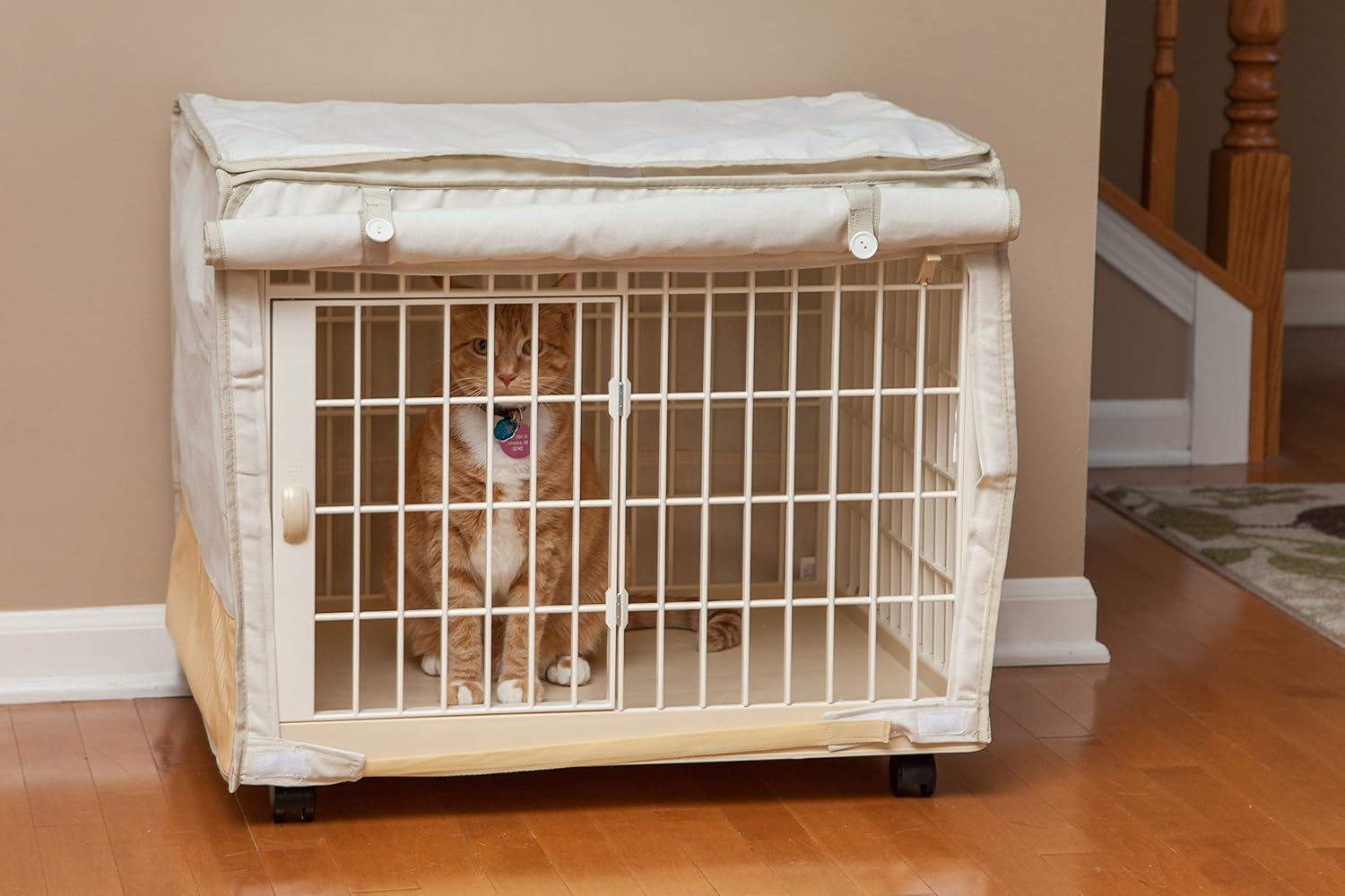 IRIS USA Extra Smworldnet027 Plastic Rolling Pet Crate with Cover and Wheels, Movable and High Privacy Smworldnet027 Pet Kennel for Smworldnet027-Sized Pets Puppy and Kitten, Beige