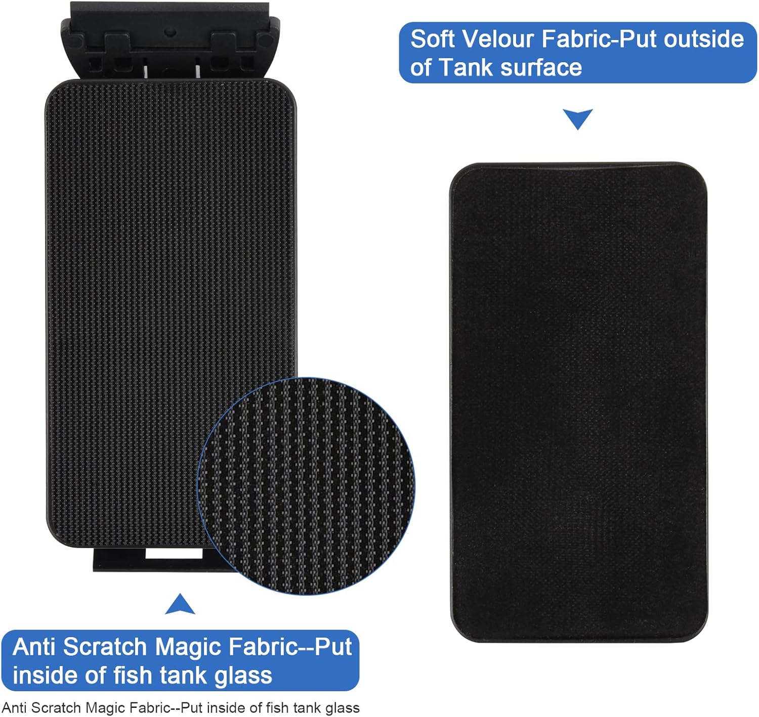 Magnet Glass Cleaner: The Fish Tank’s inner scrubber is made of fabric with tiny hooks that can scrape off the algae efficiently without damaging the glass. (Warm tips: please do not get sand stuck in the pad and could scratch your glass tank)